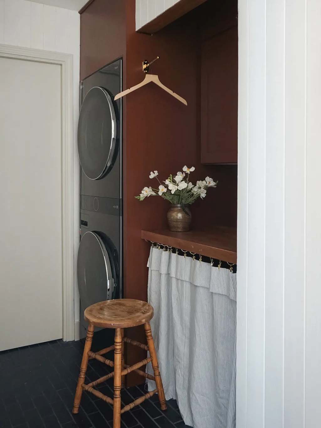 DIYer and design blogger Valeria Jacobs also thought her laundry room would be the perfect spot to play with brown, except she covered her plywood built-ins in Little Greene’s Ganache.