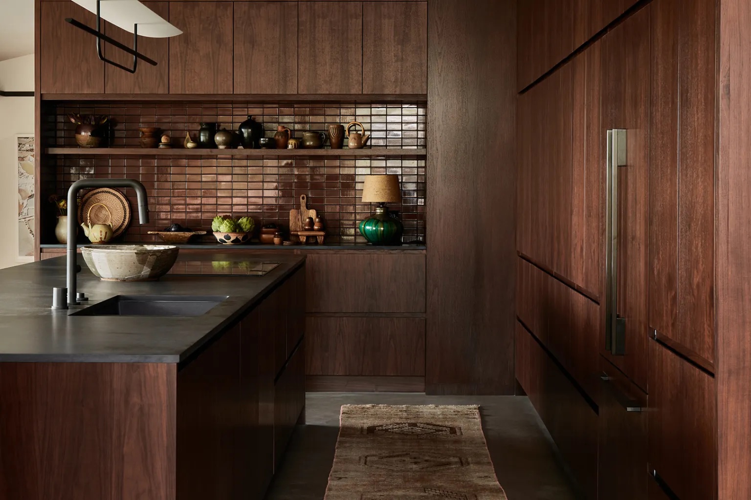 Kirsten Blazek felt like oakwood cabinets in mid-century homes had overstayed their welcome, so instead she leaned into a retro vibe with walnut doors and a brown tile backsplash that has a slight orange undertone to it for a hint of color.