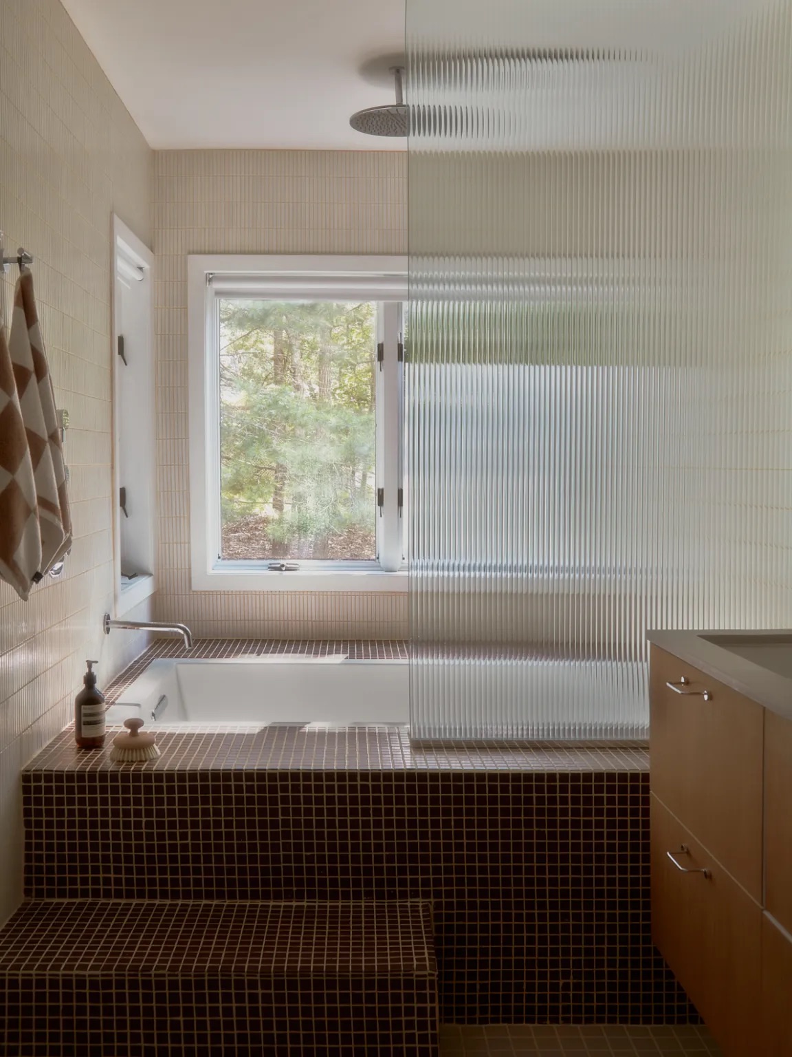 Rocco cofounder Alyse Borkan’s bathrooms used to be unfortunate shades of purple and pink, but she loved how the walls were clad in 4-by-4 tile. So she took cues from the past and used smaller-scale squares in earthy tones—including a soaking tub swathed in brown.