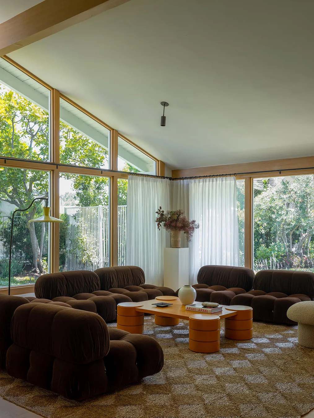 The rich brown Mario Bellini sofa in this Ome Dezin–designed living room harkens back to the Brentwood, California, home’s 1970s beginnings.