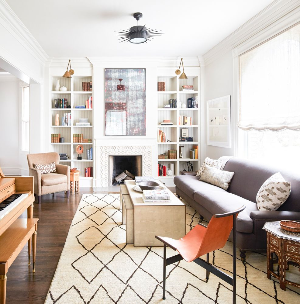 Built-in shelves were practically made encompassing fireplaces. This elegantly mod living room packs in major style with worldly flair, an aesthetic further elevated by the semi-stocked shelves and patina piece above the mantel.