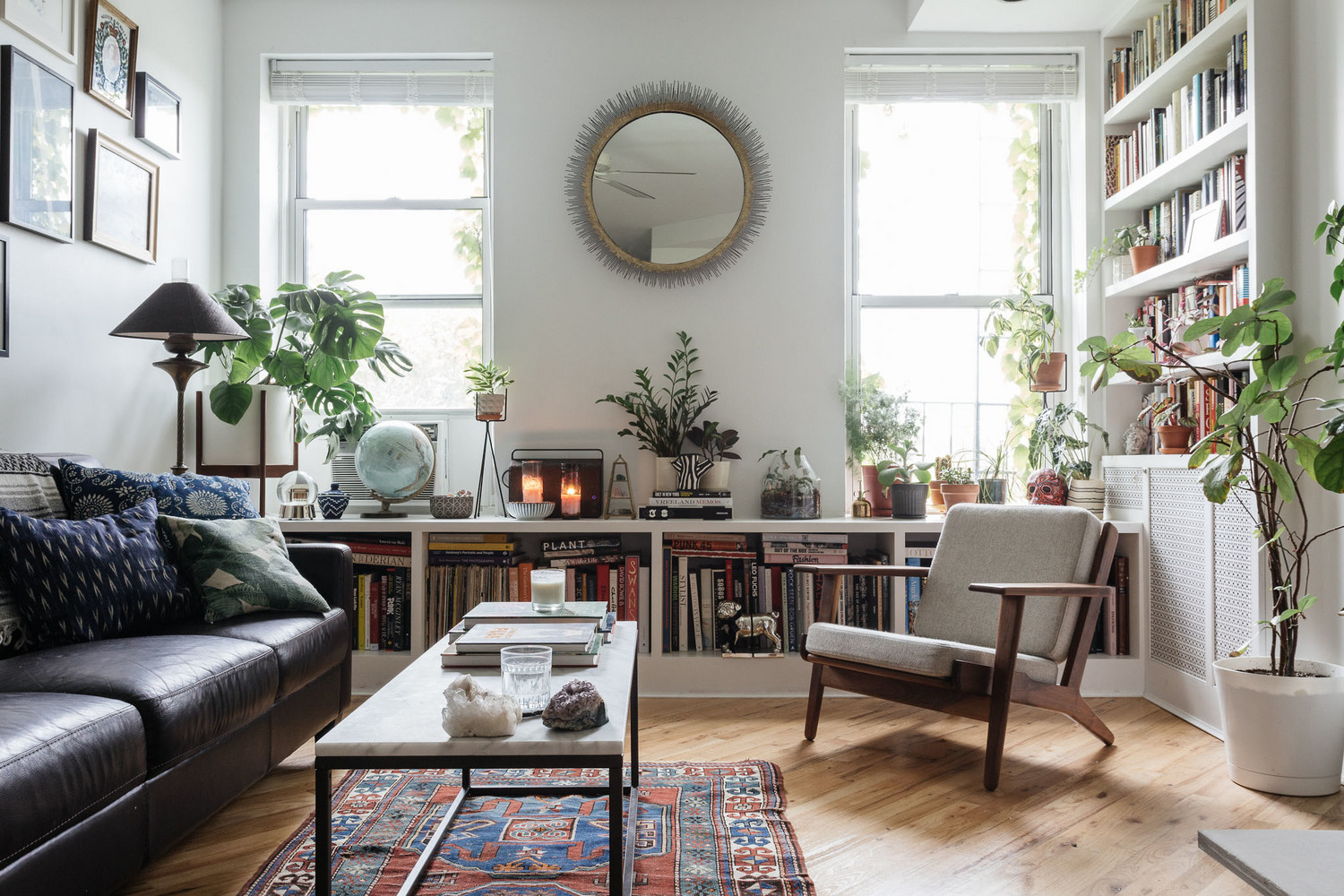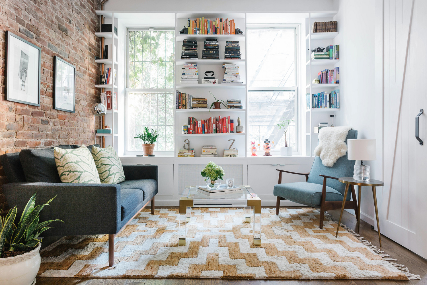 A modular set of built-in shelves uses up the negative space between the windows in this East Village apartment designed by Homepolish designer Megan Hopp. A color-coded organization system for the books brings in a much needed pop of color to the space.