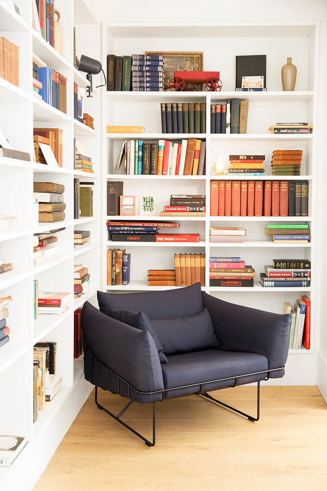 Take your built-in shelves to the next level by painting the backdrop in a bold and dynamic shade. Not only will it impart the spot with a major dose of style but it will add a layer of impact to the design. Bonus points for adopting a color-coordinated approach to displaying your books.