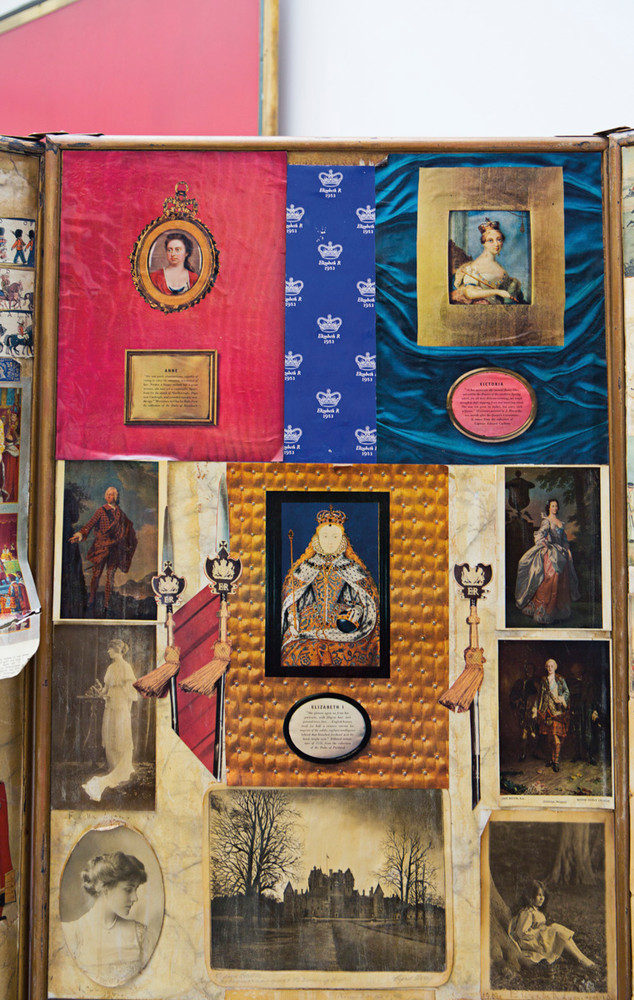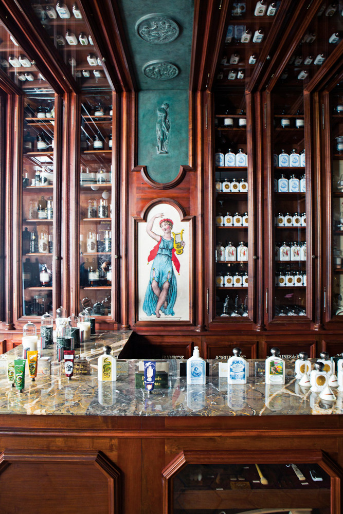 Another unifier: richly layered colors—with barely a swatch of black in sight. Contrasting deep burgundy and bottle-green marble countertops subtly differentiate the café from the apothecary, where Pompeian-style frescoes and polished oak cabinets crawl all the way to the ceiling in a playful trompe l’oeil. While crimson velvet-lined display cases and 1930s-era brass clothing racks come from Touhami’s own collection (he has hundreds more in storage).