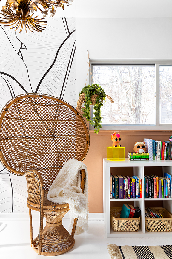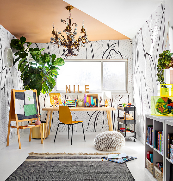 “Nile is always outside. She’s the type of child who needs vitamin D,” explains Walker. “It was important to me to bring some of that natural energy into the room. I added a lot of plants.” To further play up the outdoorsy vibe, she installed a large-repeat banana leaf wallpaper she had created for her own collection with illustrator Verna Fogg and hung a statement floral brass chandelier (a street-find score). Next, the walls got a fresh coat of Behr’s Ultra White to bounce the natural light streaming in through the windows, as well as Canyon Dusk, an earthier shade that grounds the room.