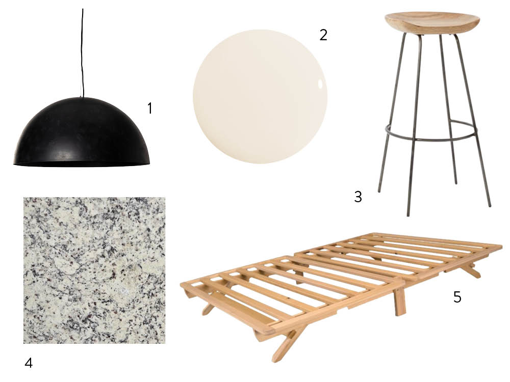All of the furniture is secondhand except the bed frames and barstools. This includes the 1970s Morso wood stove ($350), 1987 Bernhardt Flair Division modular sectional ($80), vintage Italian travertine coffee and console table ($220), and 1950s Crane Diana bathroom console sink (free). We sourced the dining set to sell in our store, but felt it best fit the cabin; it was $130 for the set.
