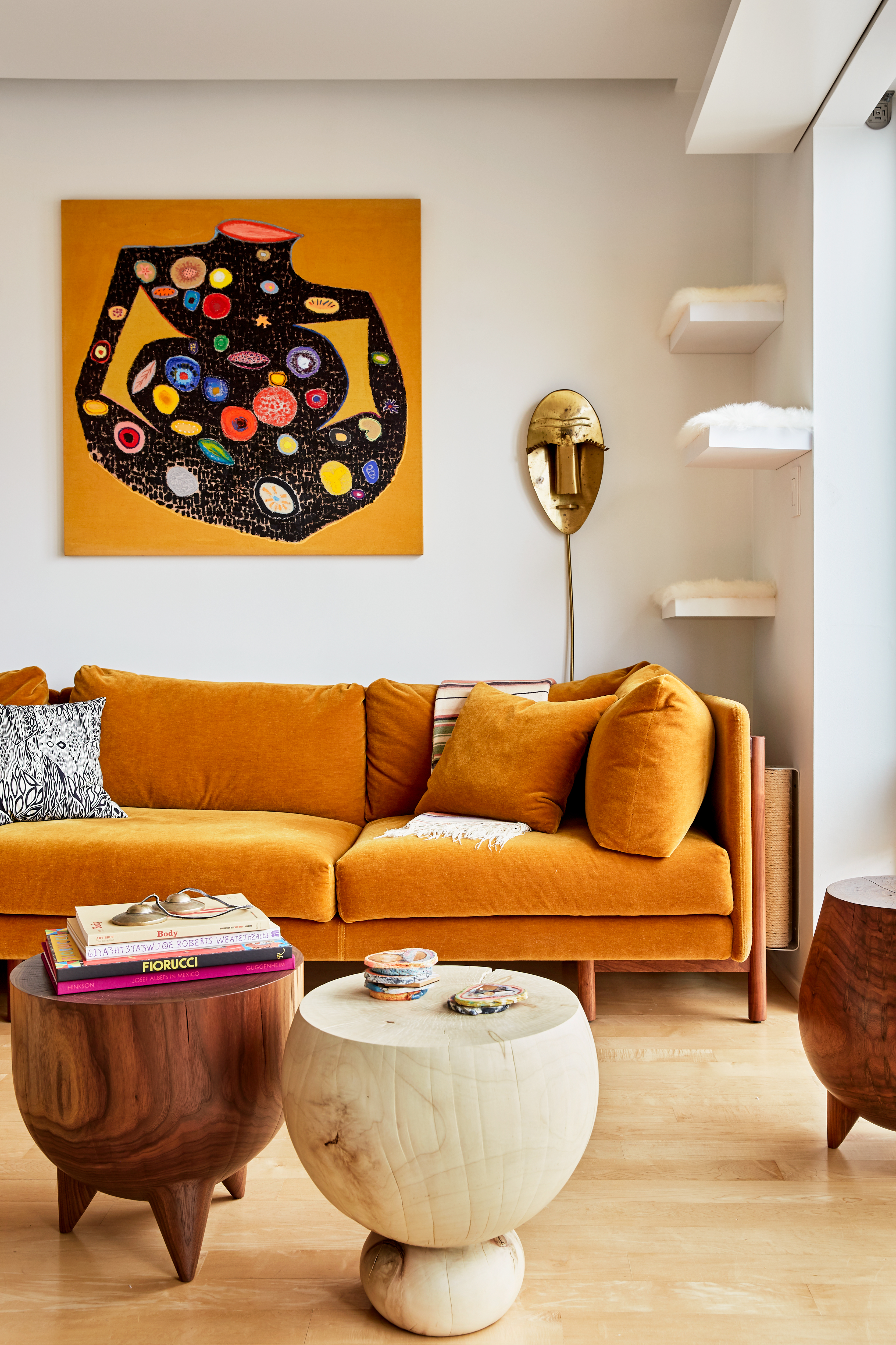 The crowning jewel? A burnt orange velvet sofa—Mociun spent two years looking for it, using benches from the roof deck and a carpet as a makeshift seating area in the meantime. She now considers it her favorite part of the eclectic apartment. We spoke to the designer to learn more about how she infused her signature style into 900 square feet.