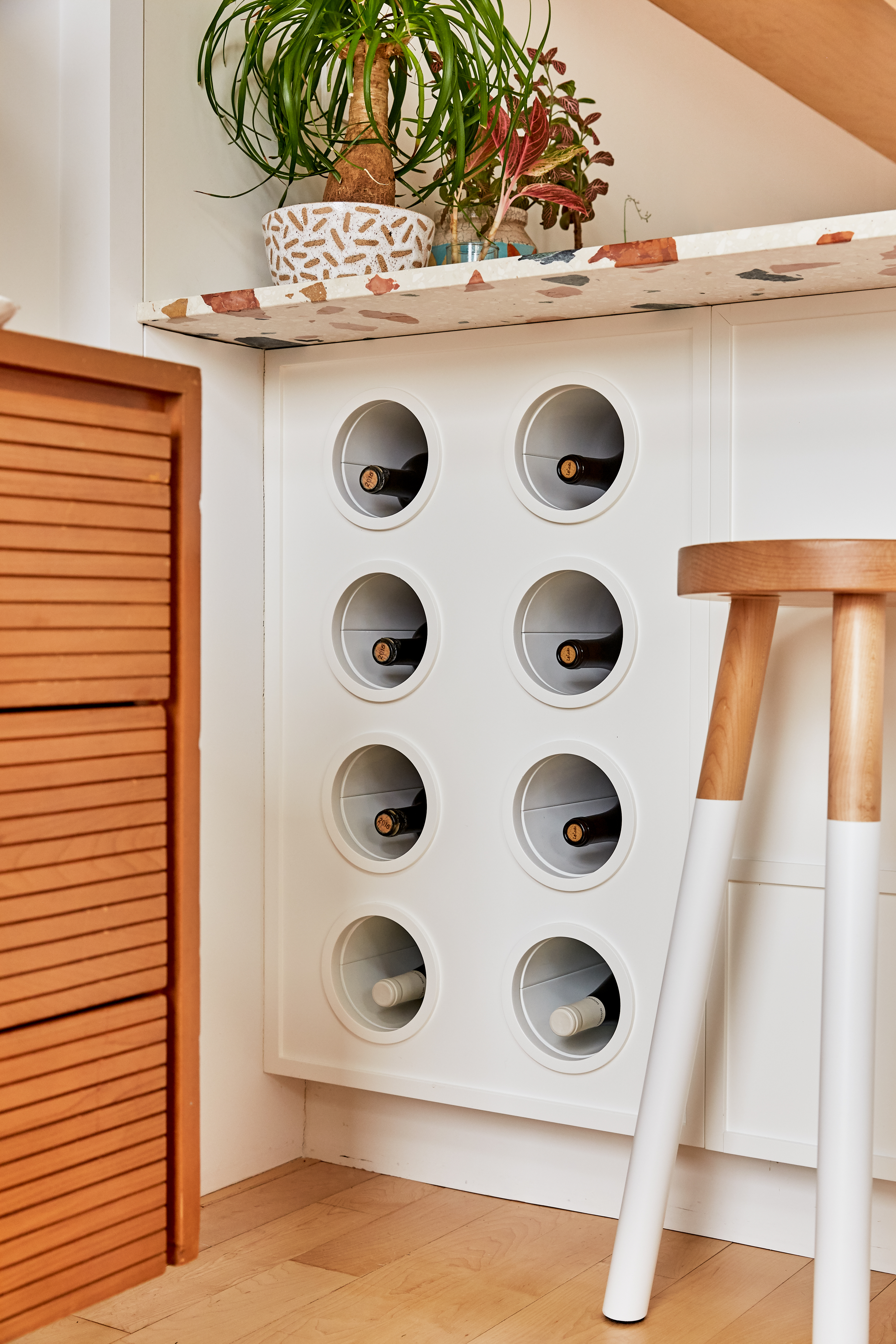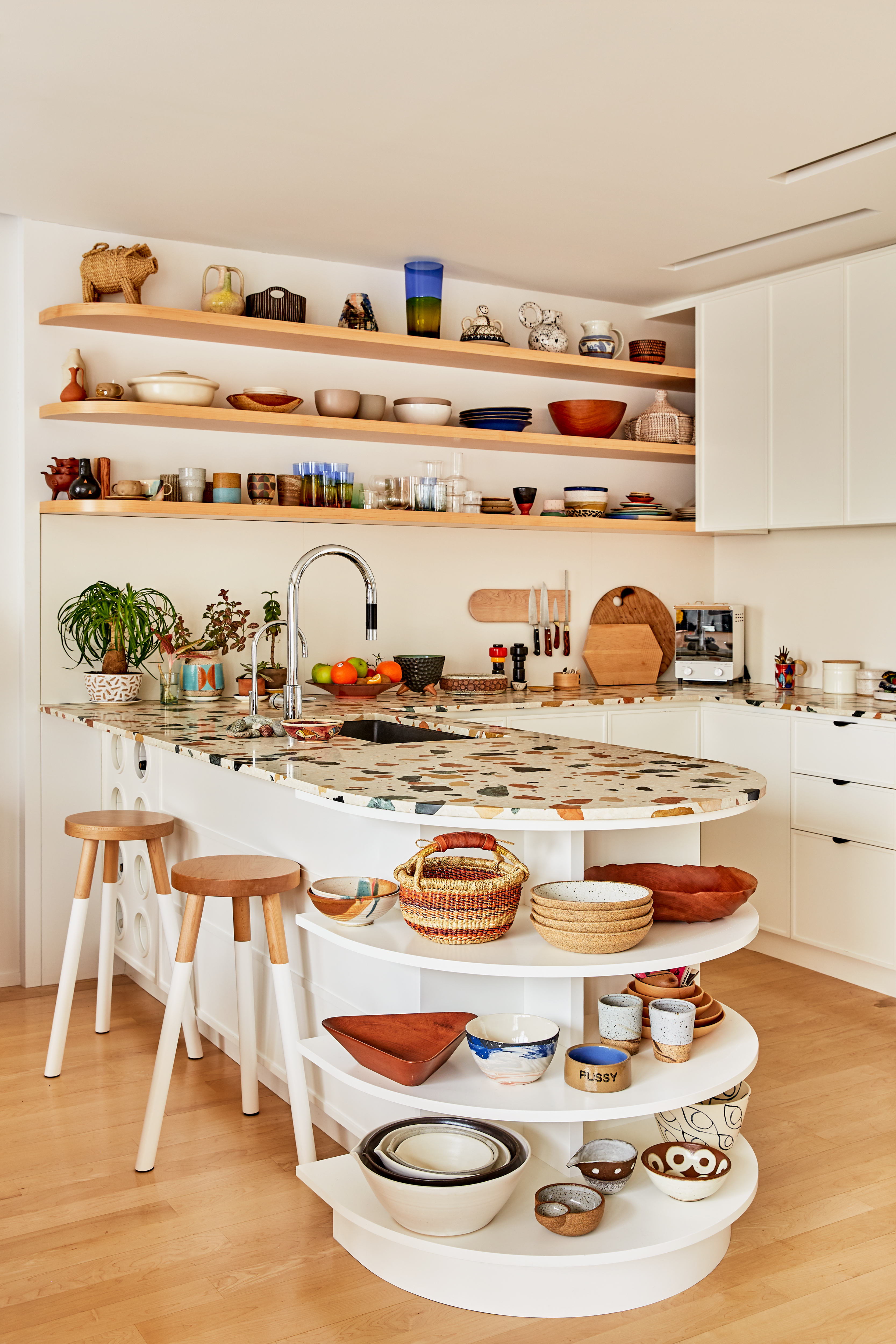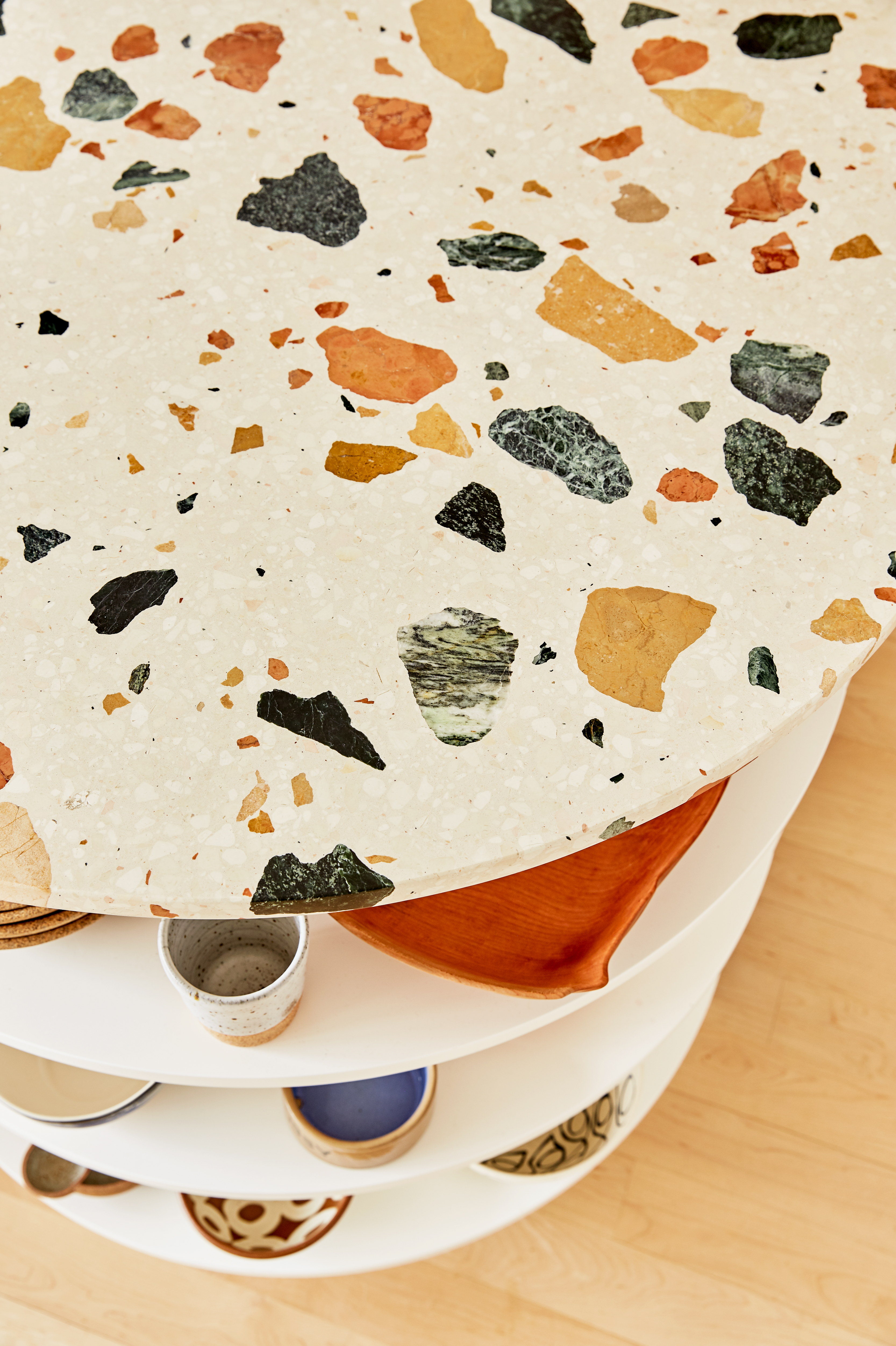 One of the most striking features of Mociun’s space is the gorgeous terrazzo countertops in the kitchen. While the rest of the space came together naturally, she says she knew right off the bat that she wanted to include a particular Max Lamb marble, having this initial jumping-off point allowed the decorating scheme to follow organically. “I knew when I was doing the kitchen that I wanted it,” she says of the stone. “The whole kitchen was designed around that countertop. Even though it’s colorful, it’s all muted, so it doesn’t feel too loud.” Flanked by light wood accents and white cabinets, it’s just the right amount of color to add an edge to the space.