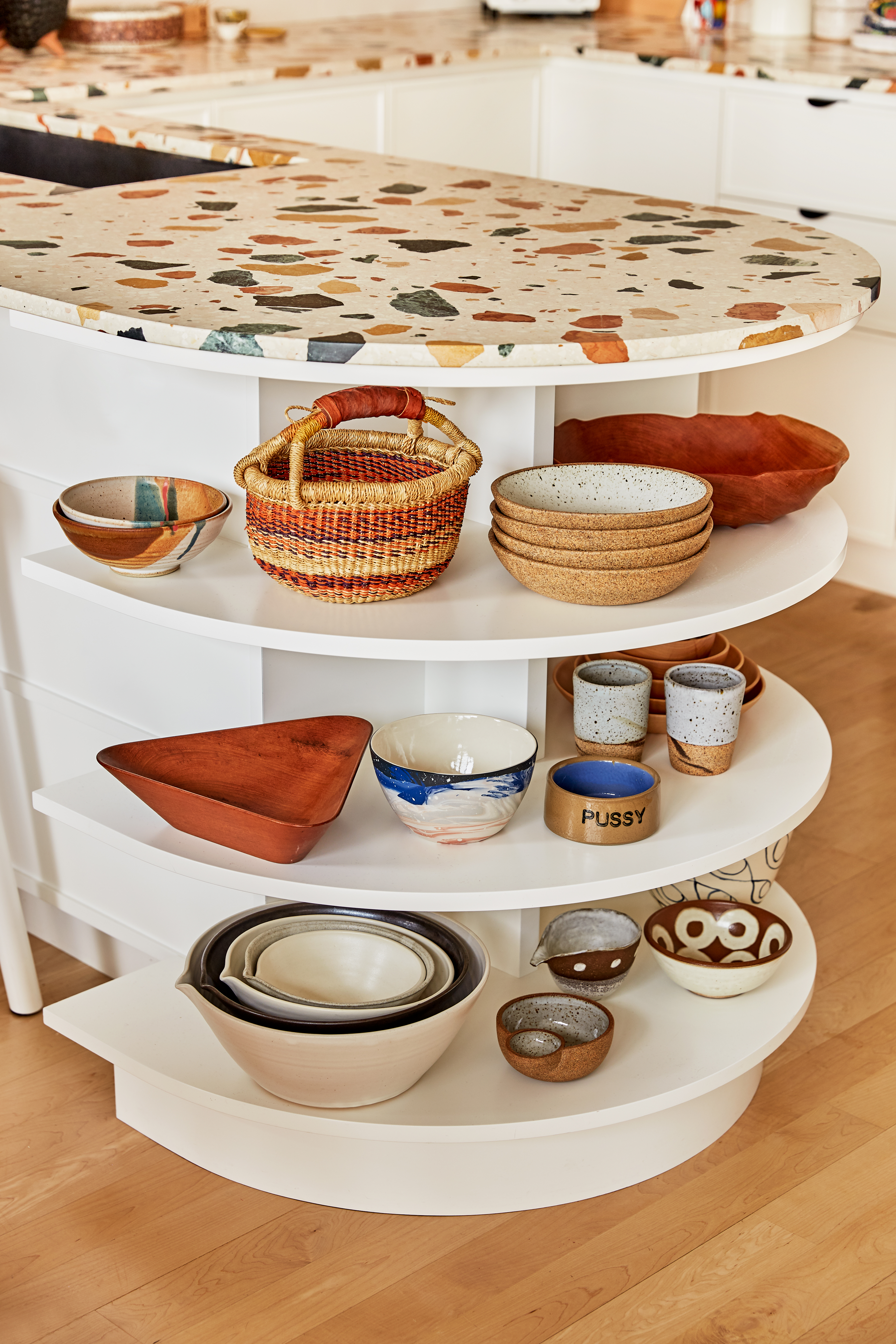Mociun and Hijazi usually take two big trips a year—most recently to Italy and the Greek island of Naxos—where they bring back an assortment of ceramics. While the recommendation to use travel to source unique home goods is hardly unique, Mociun’s spin on it definitely is: She turns to places like hardware stores and museum gift shops to find decor. “To find really amazing things, you have to go to a shitty store in a weird place. I got a cool coffee grinder in a hardware store in Greece, which we don’t even use but is really beautiful,” she says. She also recommends hitting up a local museum shop or even a craft fair. “Usually, 99 percent of the stuff is horrible, but then you’ll find one really great thing. Go to junk shops. Go to thrift stores,” recommends the designer.