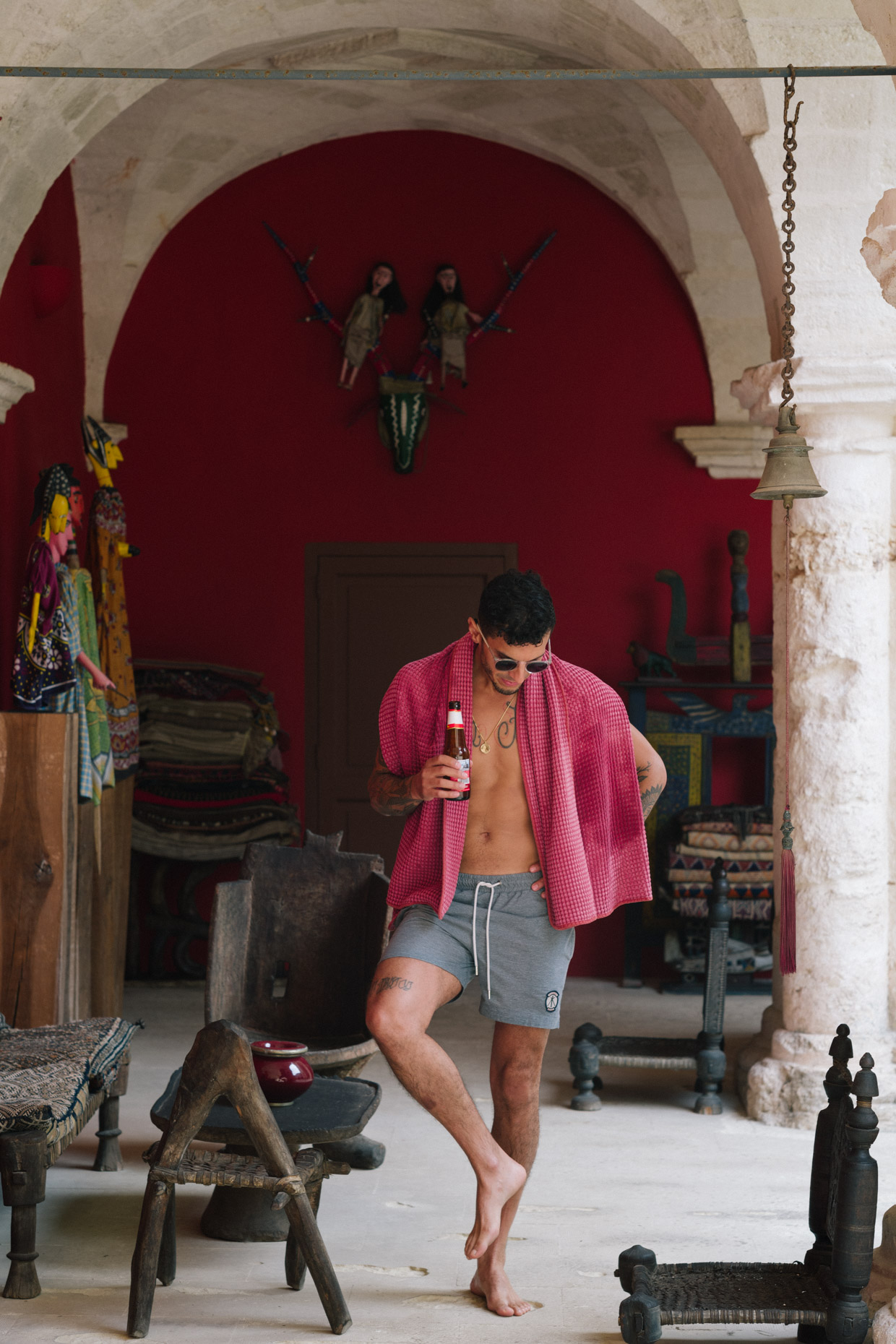 While Mociun loved the idea of tying the knot somewhere far away, she wasn’t about to leave her personality at home. To help loosen guests up after a long day of travel, the couple provided everyone in attendance with monogrammed beach towels and wigs to wear during the welcome dinner. Mociun also made her jewelry for herself, Hijazi, as well as their parents, the friend who officiated, and McAlpine.
