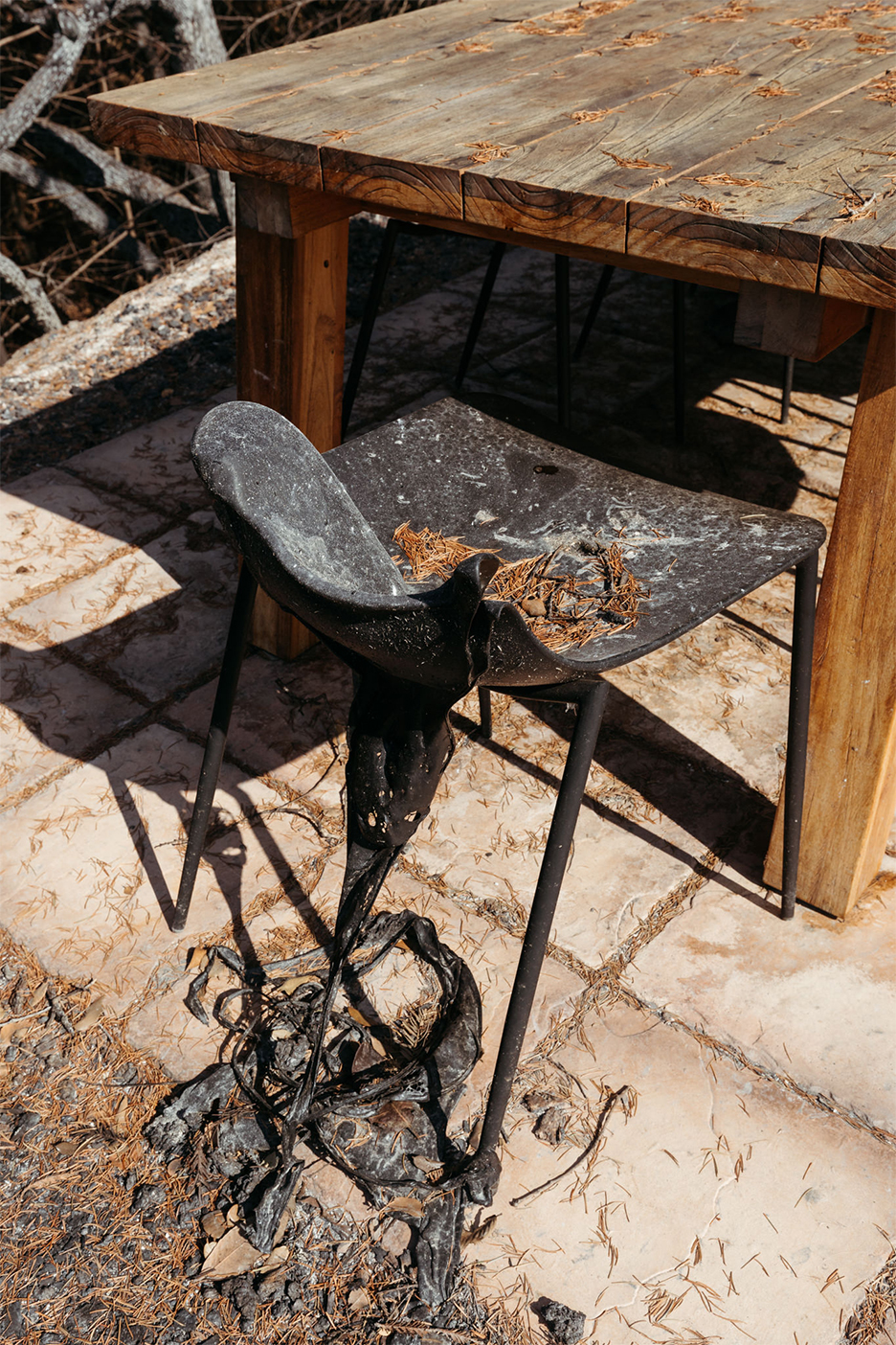 Rather than live with total uncertainty, the pair sent trusted friend and photographer Ryan Tuttle out to the property to document the damage. “One of my favorite things about photography is that it can make something that’s awful and terrible look beautiful,” says Fishbeyn, who was partially inspired by Sally Mann’s images of decomposing corpses in What Remains. The couple zoomed in on each photo to see what they could identify—metal remnants of the range, the grill, the washer-dryer. The oddest items had survived. “We found those stupid Illy cups,” Fishbeyn says to Wright, laughing. The melted dining chairs and blob-like outdoor lanterns are worthy of a Dalí painting. “At first, it looks like a stunning fall setting,” she explains, “but then you remember those trees never turned brown.”