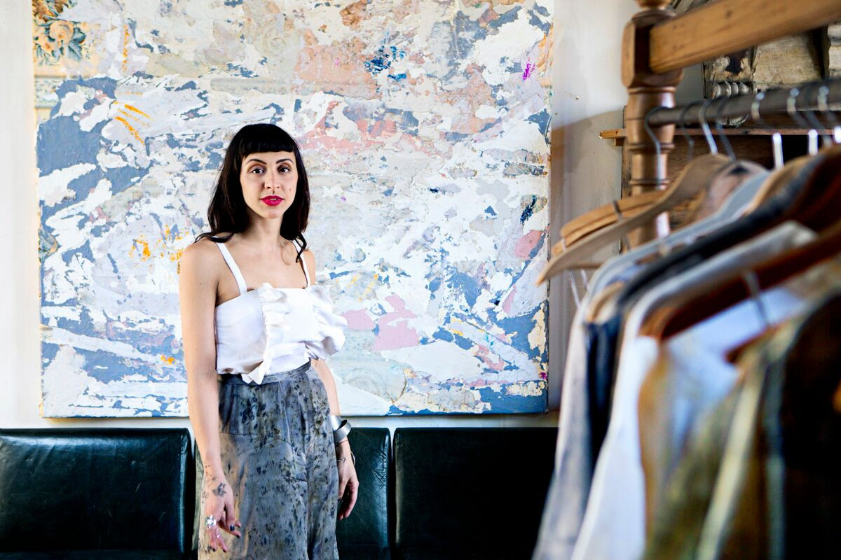Unusual and surprising dyes made from all-natural ingredients—think food waste like onion skins and avocado pits, as well as non-toxic metals and minerals—are key to her work. Plus, she sources all of her fabric ethically and works with only organic cottons and peace silk, so not only are the textiles beautiful, but they’re sustainable as well.