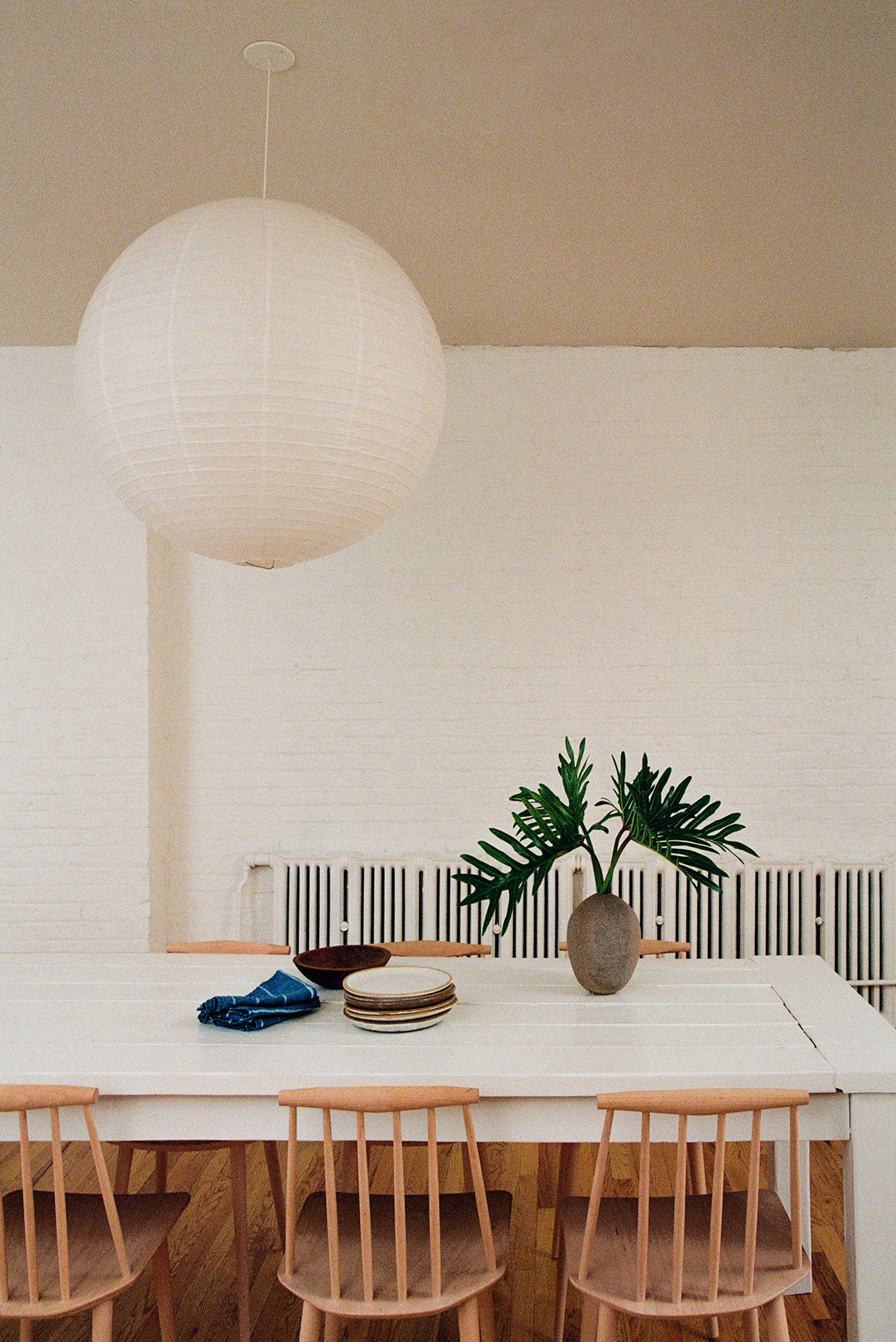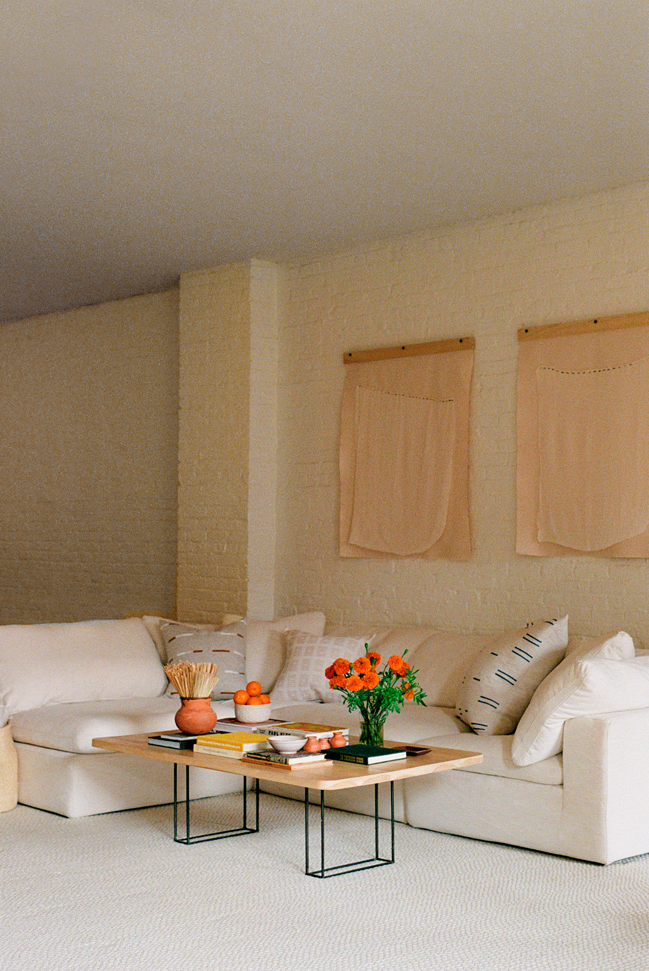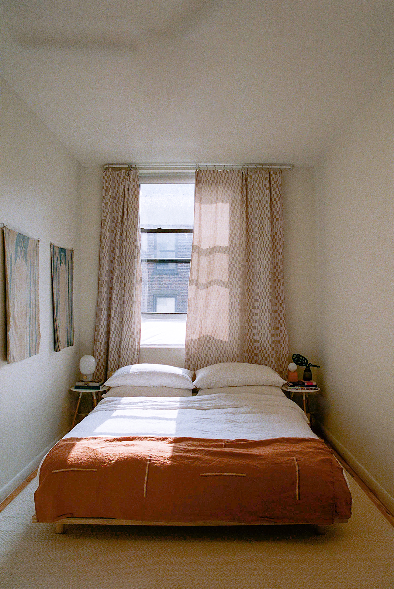 Testing out this theory, Hurley lives with her popular block-printed pillows and blankets, prototypes, and vintage treasures that she picked up at flea markets and shops around the neighborhood. “I like to use pops of color, but I need the big pieces to be neutral,” she says. Accents of bright indigo and black stand out against a range of ceramics in dusty pastels, adding texture and dimension. Above the extra-deep living room couch (which Hurley chose specifically so guests would be “sort of forced to lean back and be cozy”) is a pair of wood-and-metal quilt hangers she designed to easily rotate the textiles on display. Currently, her cream-and-peach tapestries feature layers attached to a canvas by a single thread, so when the air blows, “it looks like laundry in the wind.”