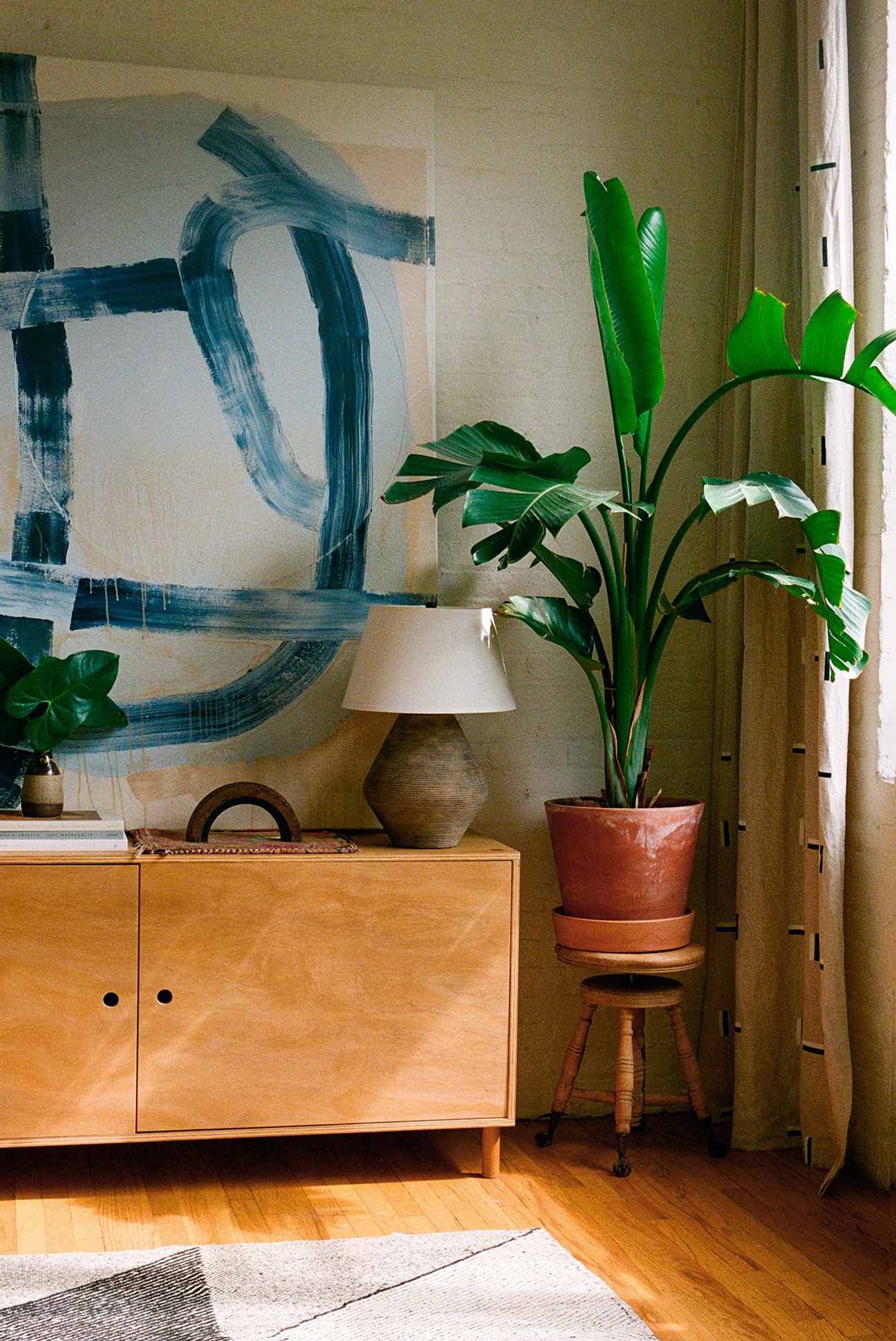 Scattered throughout is custom furniture of Hurley’s own design, a new venture that came about organically when she saw a need: “It was really hard for me to find pieces that weren’t $7,000 or wouldn’t fall apart in a year.” With simplicity and function in mind, she sketched her media cabinet, entryway credenza, and bar, then handed the drawings over to a woodworker, who brought them to life in plywood. (Some of these items, as well as a desk and Donald Judd–inspired chair, are now available online from her brand.)