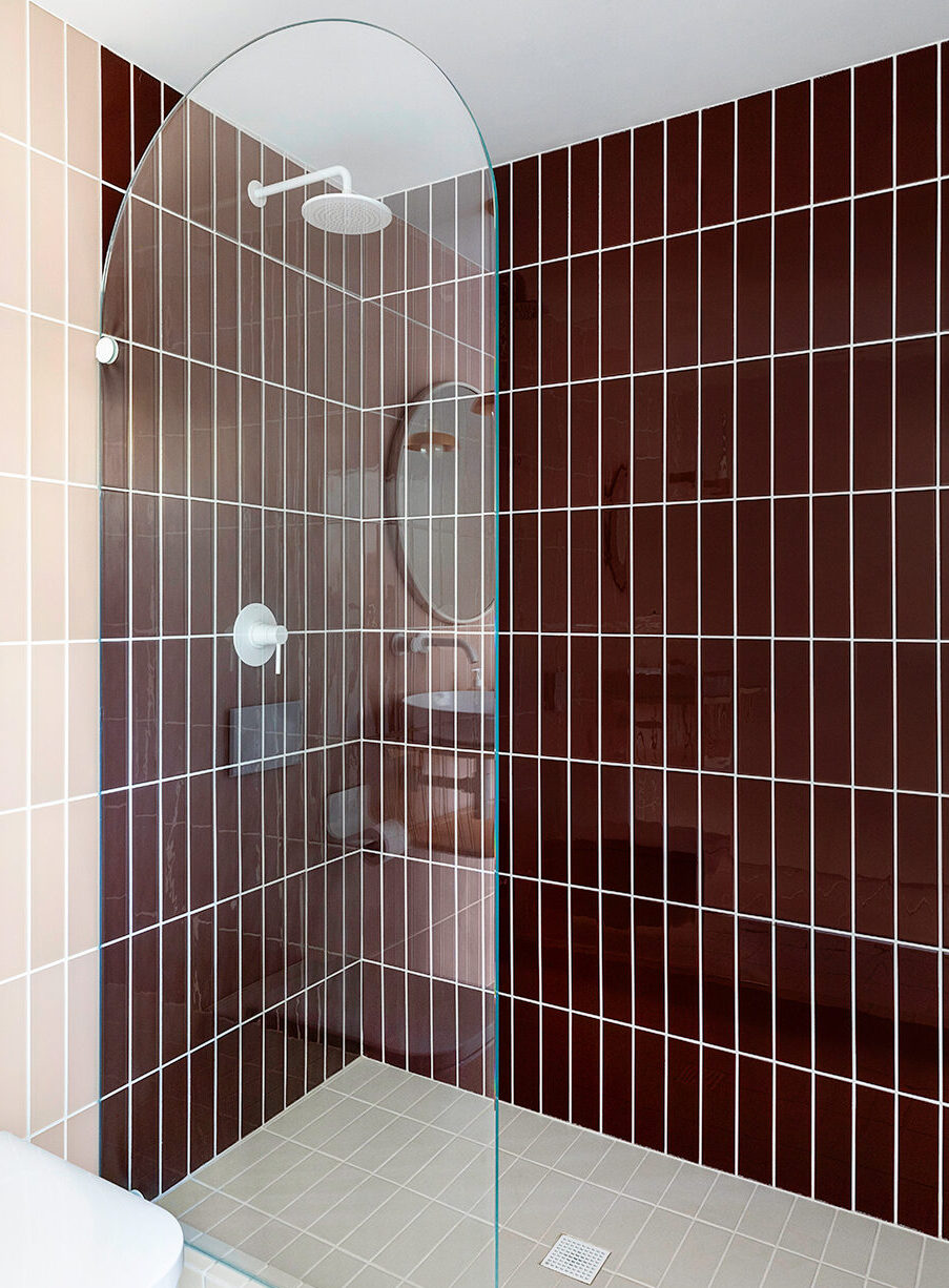 The slim profile and variety of shades make the possibilities endless. In the kaleidoscope-style bathroom pictured above, the smart use of 2-by-8 rectangles gave homeowner Racheal Jackson the ability to go wild with color. She used nine(!) different hues for the floor that she modeled after the pattern of DNA sequencing. Sara Simon and her husband, Sven, on the other hand, went in a more subdued direction in their California house, with white plumbing fixtures and a blush and burgundy tile pairing that sets more of a moody scene. If this scaled-down trend has proved anything, it’s that sometimes it pays off to play small.