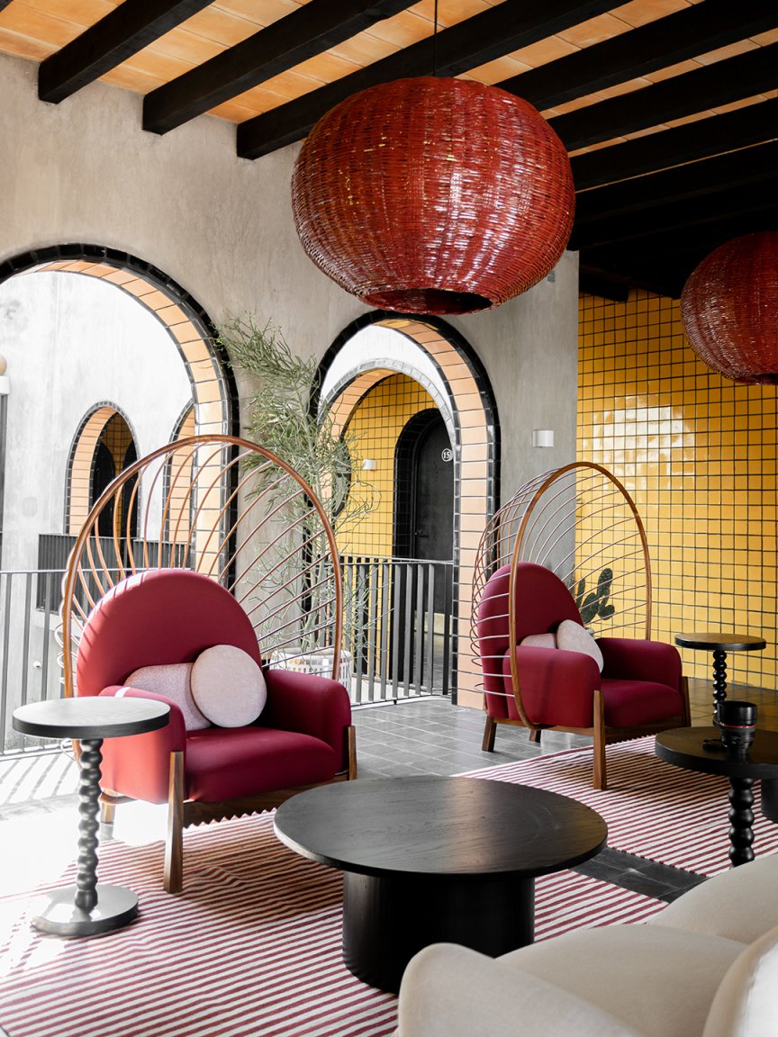 To hide part of the exterior, Gutiérrez covered the balcony walls in sunny marigold tiles from floor to ceiling, carving curved openings for doors and circular windows along the interior courtyard as an homage to the city’s Colonial influences. “It’s the perfect light reflector to illuminate the corridors during the day,” he says.