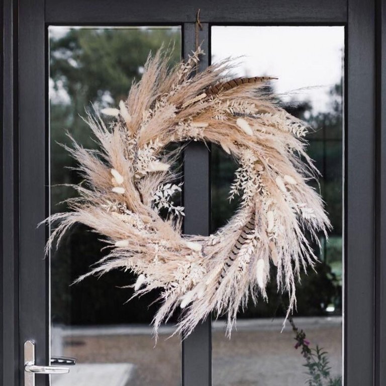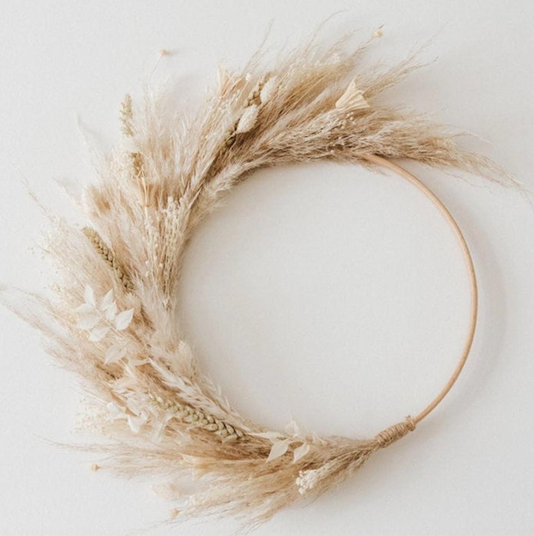The latter, usually found in arid climates but available all over the Internet these days, is often used as a table centerpiece or in a vase arrangement; you’ve also probably spotted it in wedding florals. But a wreath made solely from the fluffy plumes, like CB2’s full, textured taupe-hued offering, is a brand-new take on the trend. Hang it on your front door, frame it within the molding on a wall (if you have it), or even place it on a windowpane (all you need is an adhesive hook).