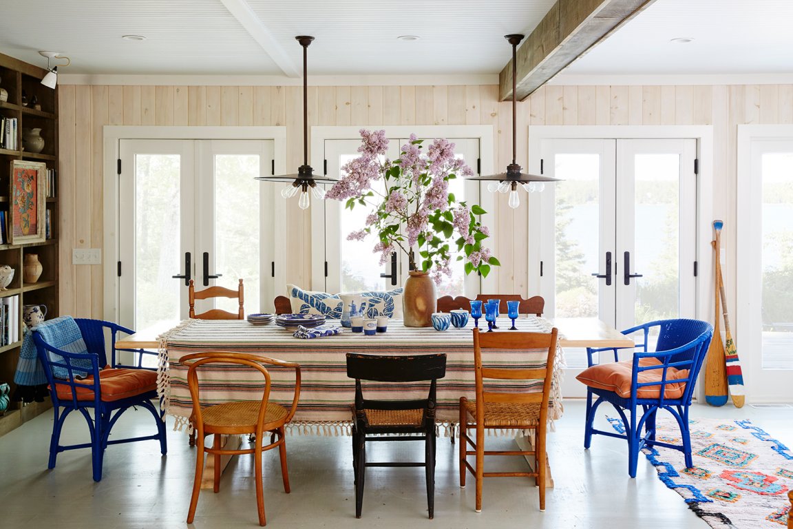 Frances Merrill of Reath Design doesn’t shy away from a good wood-paneled wall. She loves to underline the rusticity of the planks with other cabin-inspired touches: checkered table skirts, oil paintings, patchwork quilts. And by keeping the lines of the furniture clean and modern, the space feels anything but dated.