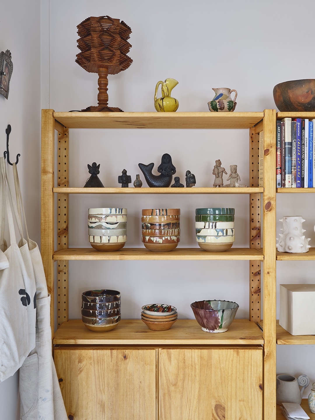 To store and display my objects, I bought IKEA’s Ivar system for $318. Its classic raw-wood look is so universal—staining the piece easily elevated it. The only tricky part was achieving a uniform finish, because I was working outside in the Texas heat (the liquid was drying very quickly). My husband and I added matching stained-wood knobs to the lower cabinet doors, which are inspired by Mexican architect and designer Luis Barragán, who often incorporated square pulls into his home designs.