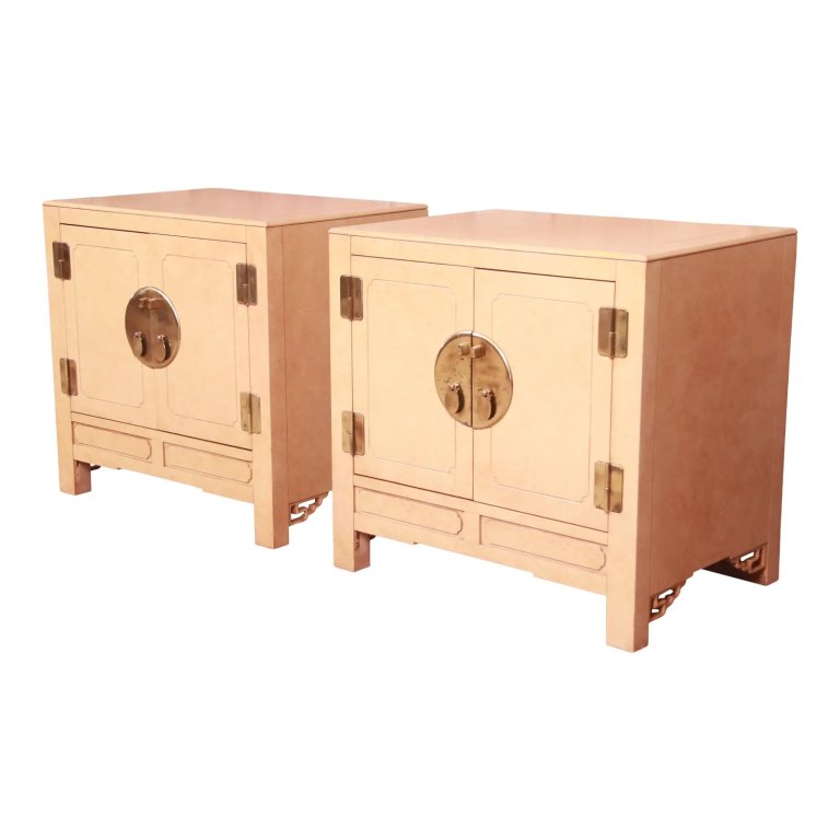 Hollywood Regency Chinoiserie Lacquered Faux Goatskin Bedside Cabinets by White Furniture, Pair