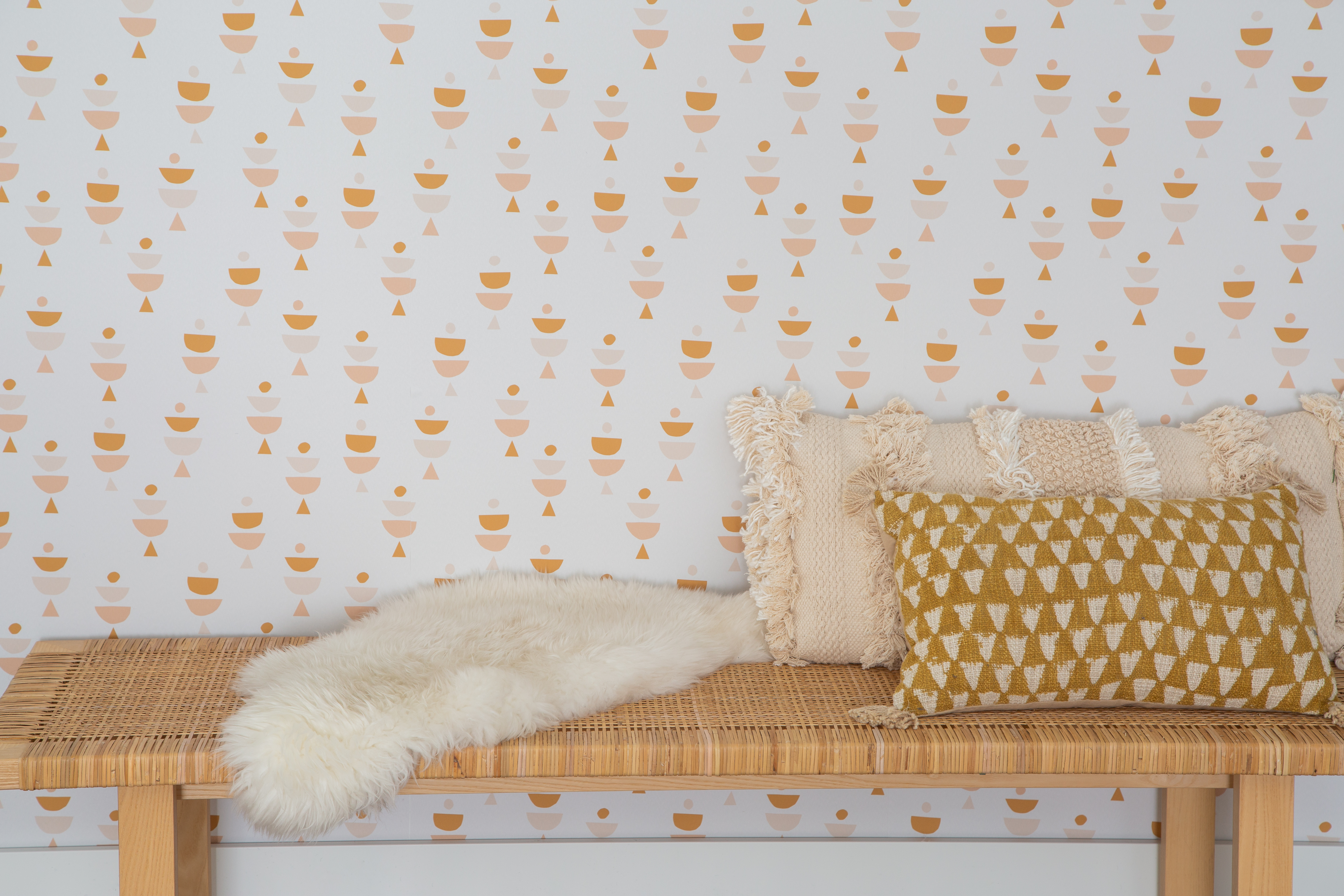 Chasing Paper founder Elizabeth Rees recommends using the Spotted print in the pink and orange varietal to DIY a faux headboard. “You will need approximately two panels,” she says of this low-lift project. “You can cut them to your preferred shape and stick them behind the bed.”