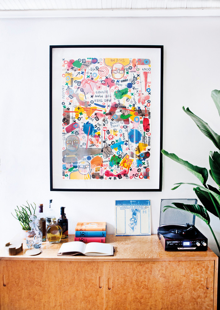 Although their studio is located just around the corner, the couple’s works-in-progress and recently completed pieces often settle in the loft, which acts as a makeshift gallery. “We think of it as a different zone, a different art project,” says Frezza of the home. The backdrop provides a place for Chiaozza’s palette to really pop—which is inspired by everything from industrial materials (orange traffic cones, fluorescent yellow warning signs) to nature (pink and purple sunsets).