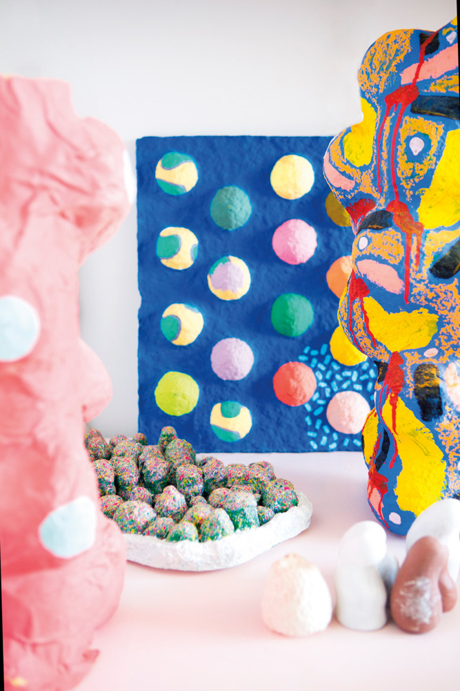In a loft in Brooklyn’s most vibrant arts district, Bushwick, live Terri Chiao and Adam Frezza, along with their 6-month-old daughter, Tove, and cat Giro. Together, the pair go by Chiaozza and are known for their giant sculpture field at Coachella, installations with Nike and Régime des Fleurs, and electric-hued work peppered throughout the US. Bold palettes are their forte—whether in the form of paper-pulp sculptures in far-out shapes, geometric murals, or 3-D paintings.