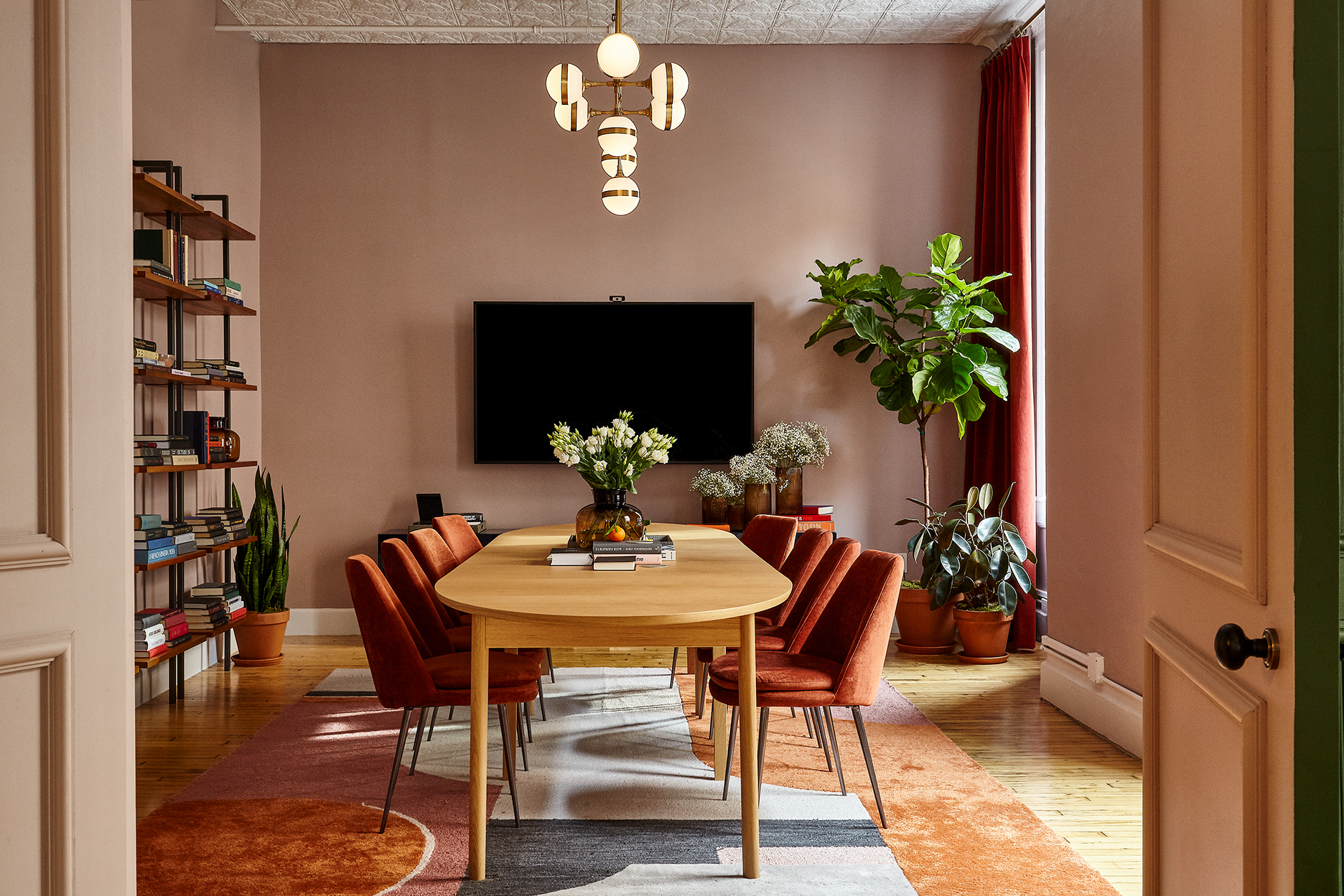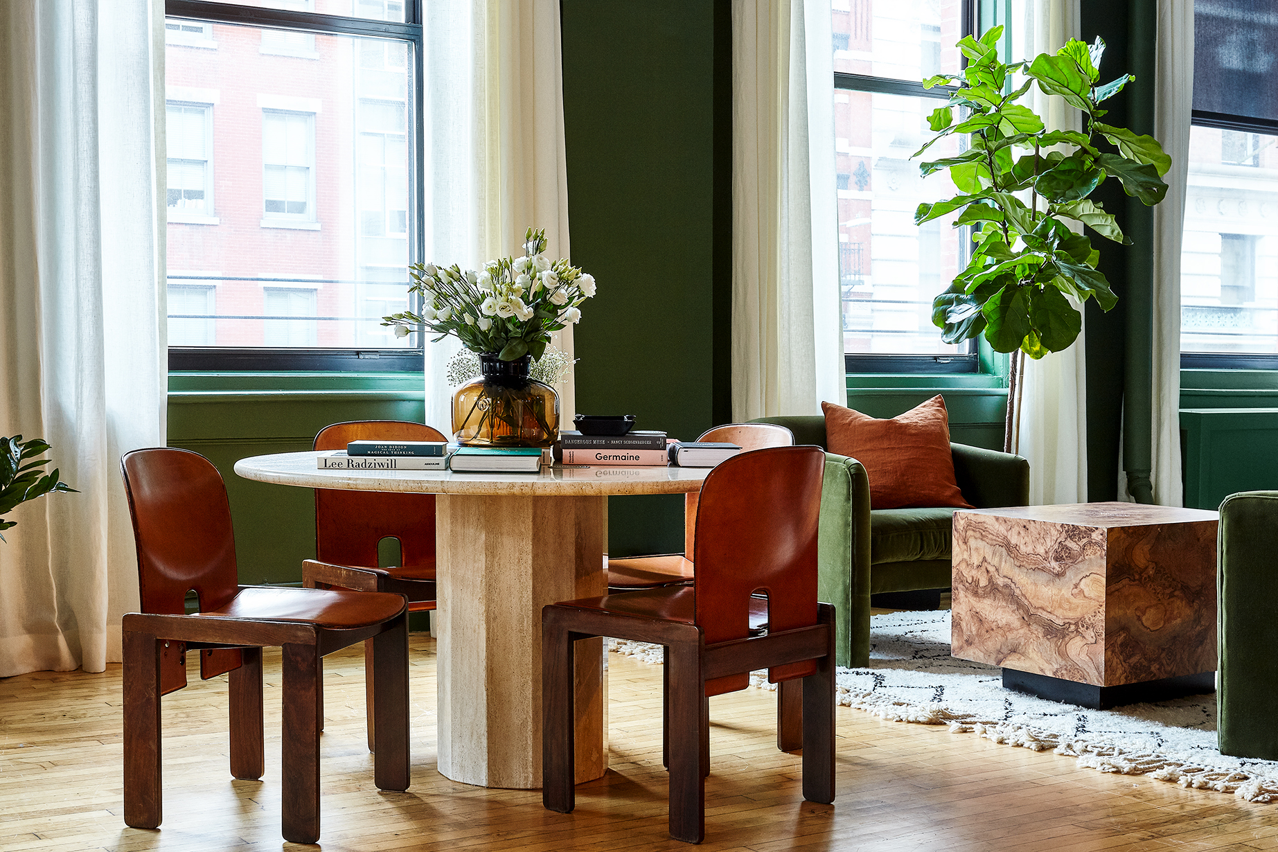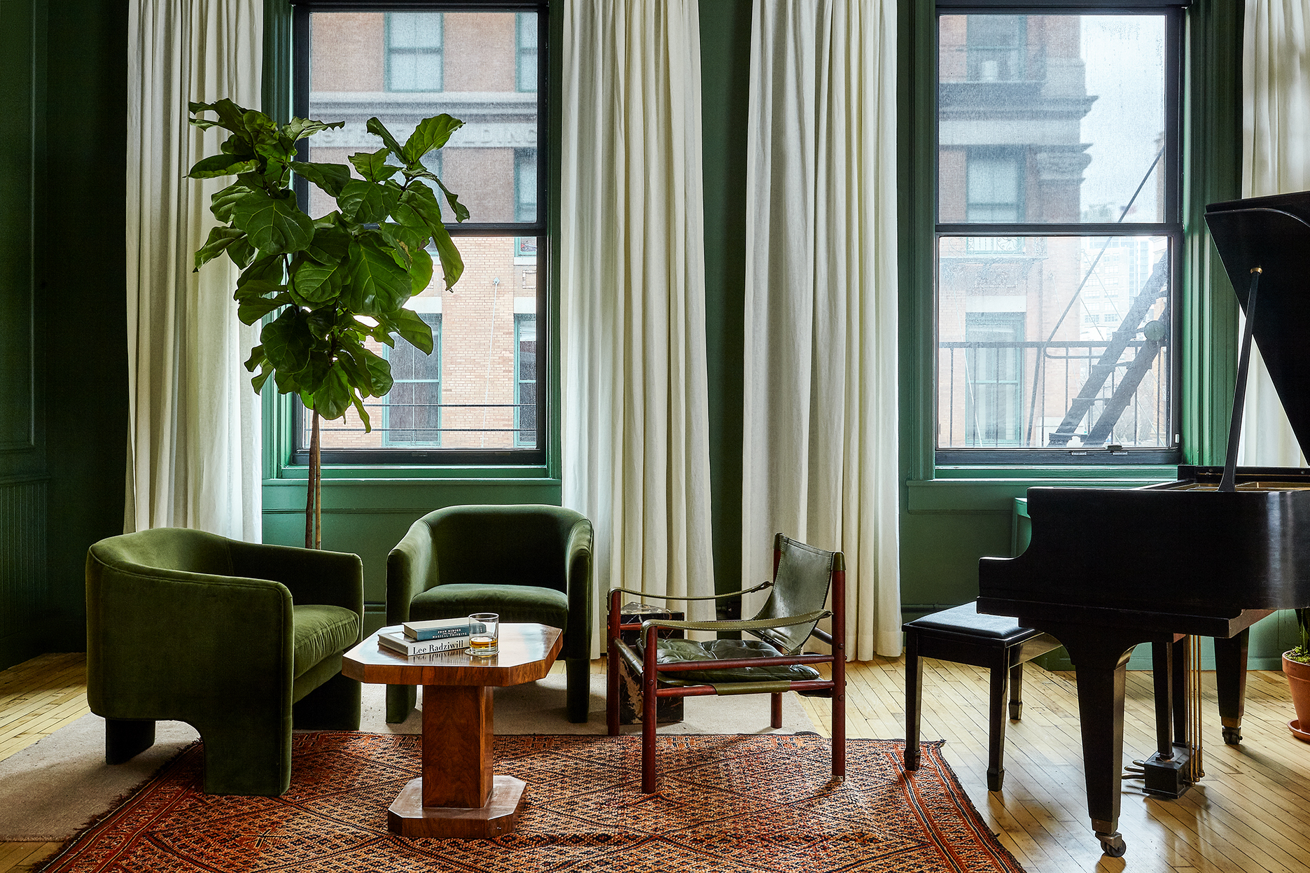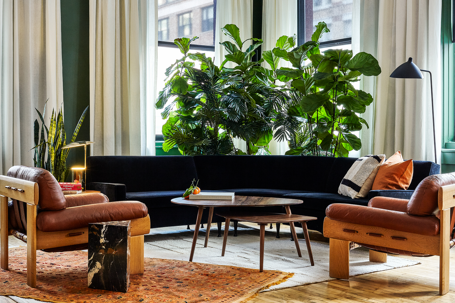 “We drew initial inspiration from the green rooms of conferences, where we have experienced some of the most thoughtful and interesting dialogues with professional contemporaries,” says Kaplan. “The clubhouse was designed to capture this atmosphere and energy to spark conversation—with a focus on community, not coworking. By redefining the traditional brawn of leather and rich hunter green, our goal was to create a secret, off-limits space that feels at once upscale, timeless, intimate, and relaxing.”