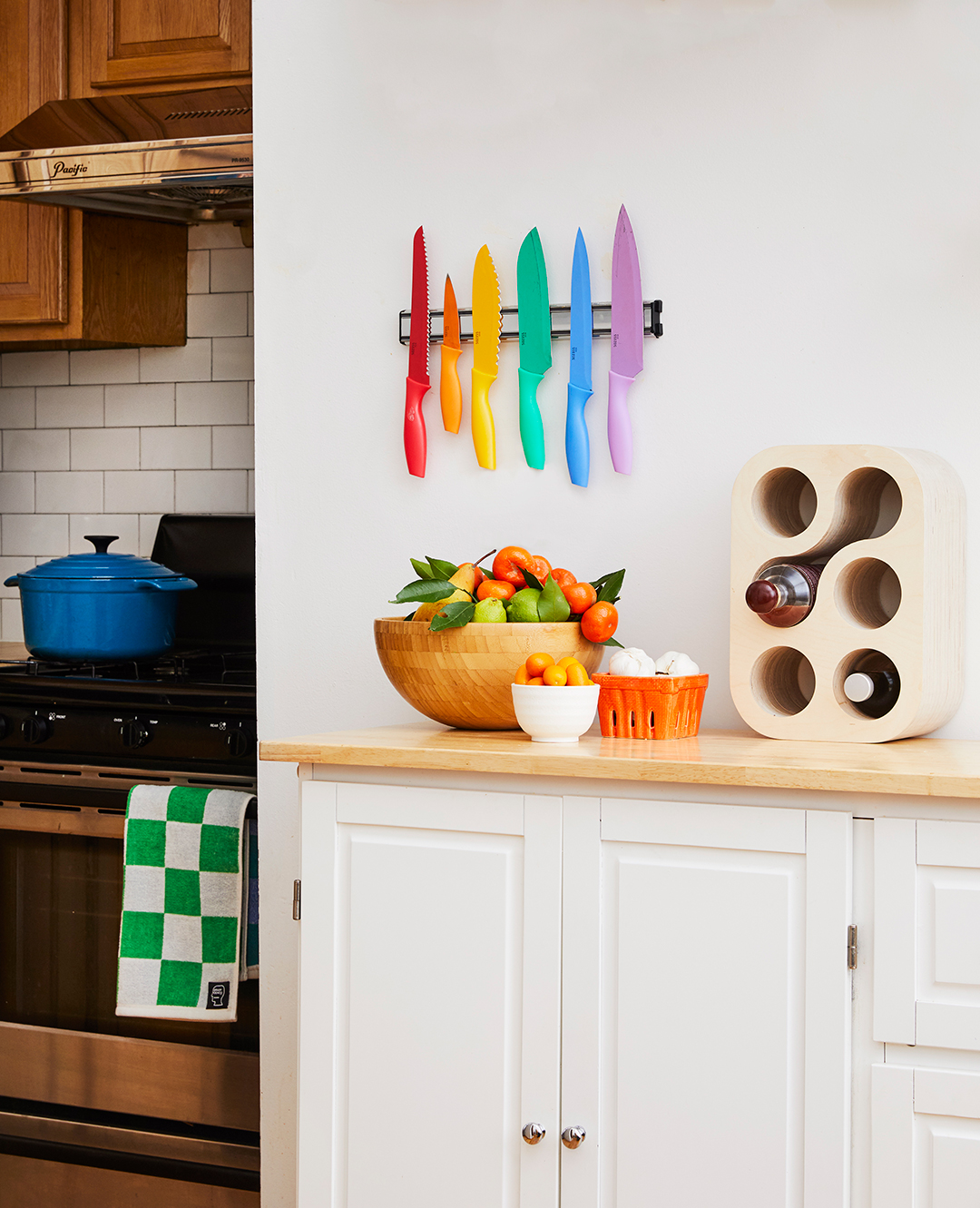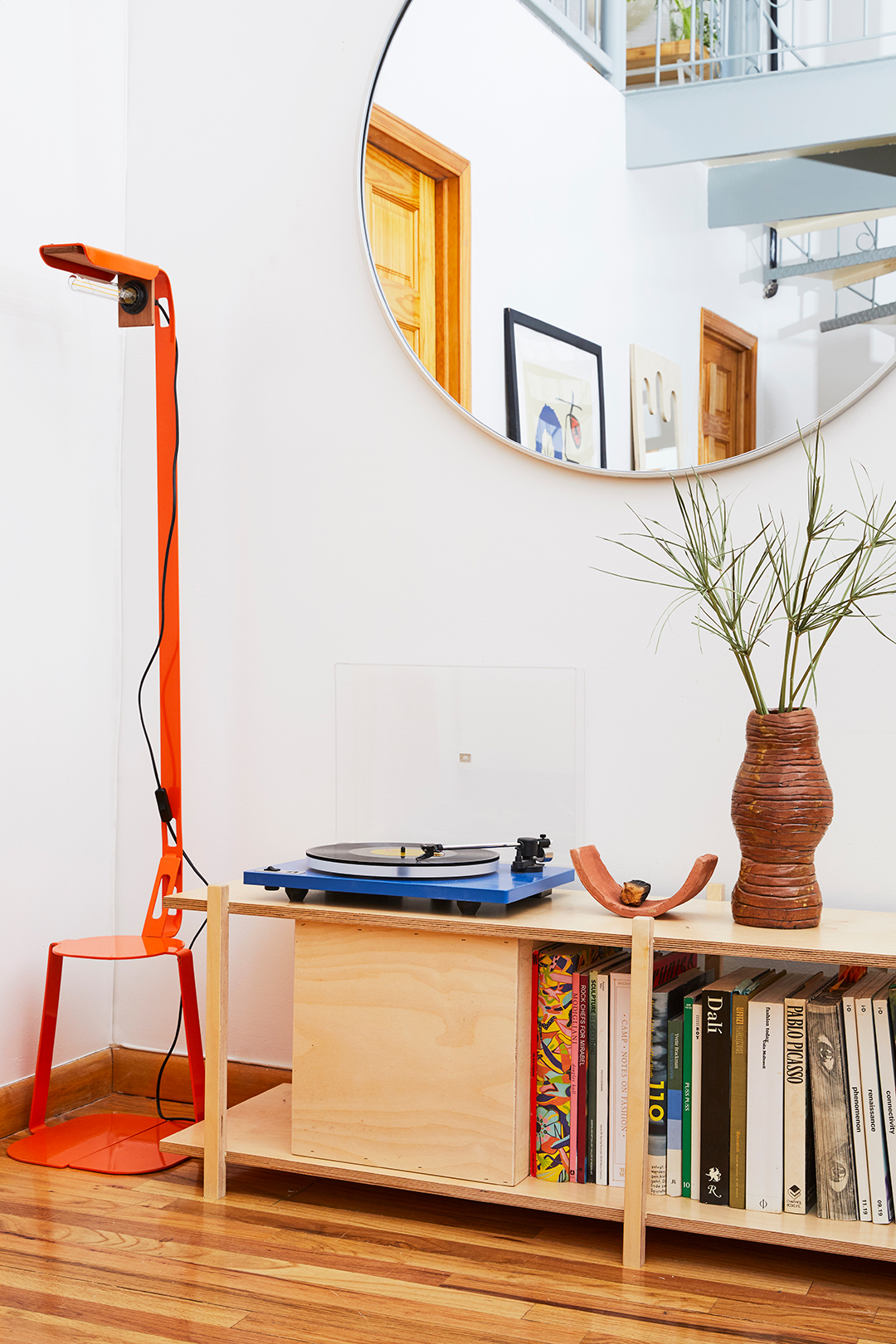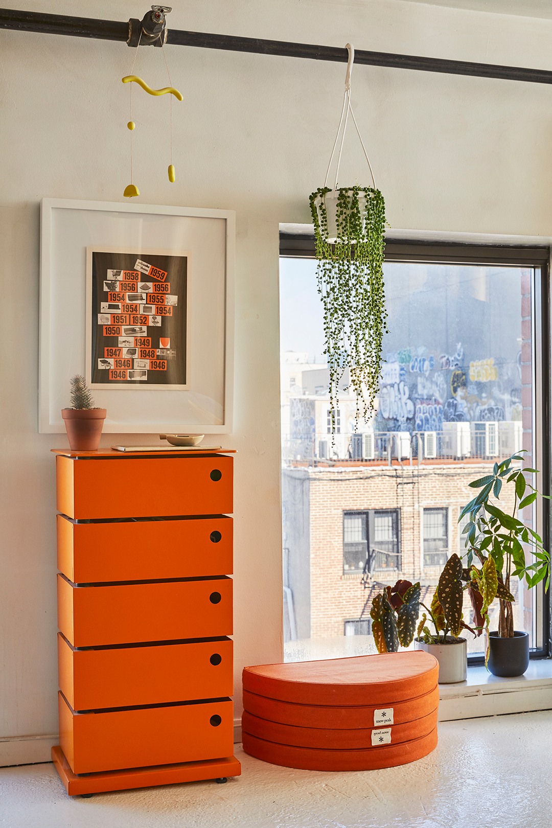 Rather than hunt through vintage marketplaces or take the bus to IKEA, Espinal designs the exact pieces she wants—and then constructs them at Lichen’s workshop. Take her plywood creations: a curvy bedside table and a cutout wine rack in the kitchen (both will soon be available at Lichen for the masses, don’t worry). The former doubles as a magazine rack when flipped on its side—Espinal opts for multiple functions wherever possible—and the latter was simply an aesthetic hole that needed to be filled (chic bottle storage is difficult to find). “I like exercising that design muscle whenever I can,” she says. Working for a vintage seller has another perk: getting first dibs on new inventory, like an orange storage system (Espinal uses it to store clothes) and an equally citrine floor lamp in the living room by Nmbello Studios.