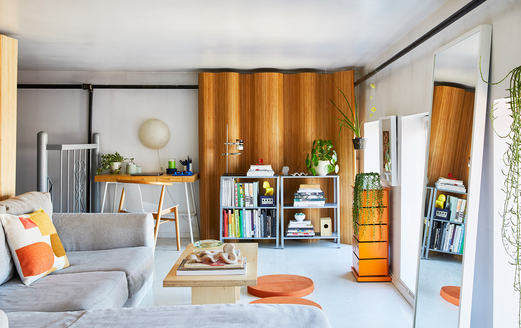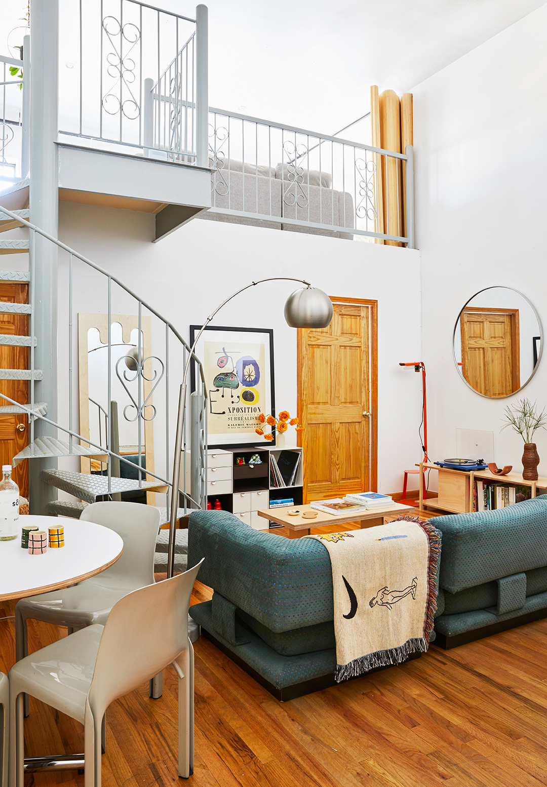 When friends are over, Espinal only has to take a few steps to join in on the fun—the bedroom overlooks the length of the lower living space. At bedtime, a flexible, lightweight room divider gets unfurled and positioned right up against the railing for a bit of privacy. “On the weekends I keep it rolled up so the rest of the apartment can get as much sunlight as possible,” she explains.