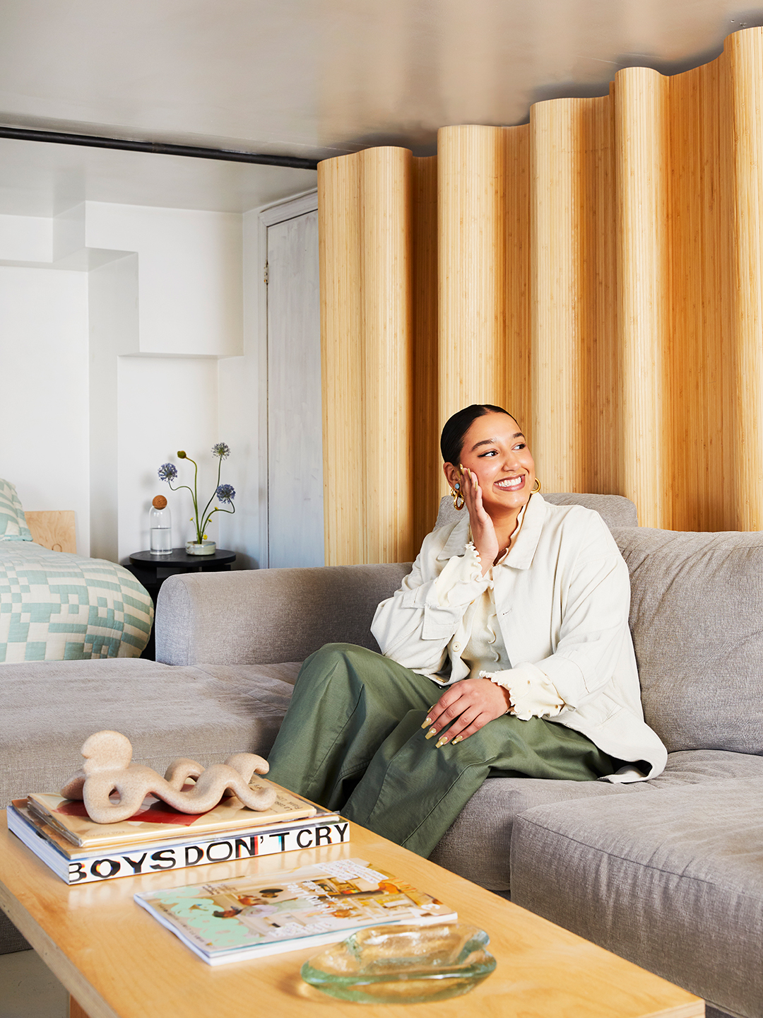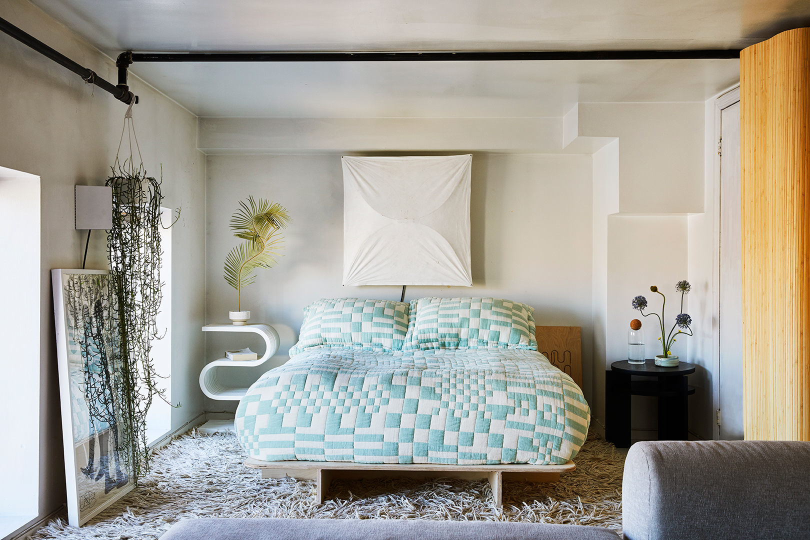 While low ceilings aren’t usually an enviable feature, Espinal loves the way the loft’s 6-foot-2-inch height frames the short windows. “It’s a perfect place to meditate and read,” she says—and it helps that she’s just above 5 feet tall. She mostly works in person at Lichen’s store, helping customers and designing its fan-favorite plywood mirrors, but the sectional carried over from her last place is her preferred spot to answer emails after hours. (Plus the L shape conveniently demarcates this zone from where Espinal sleeps.) Her desk at the other end of the room, while perfect for displaying prototype trays and doing her makeup, doesn’t actually get much use 9-to-5.