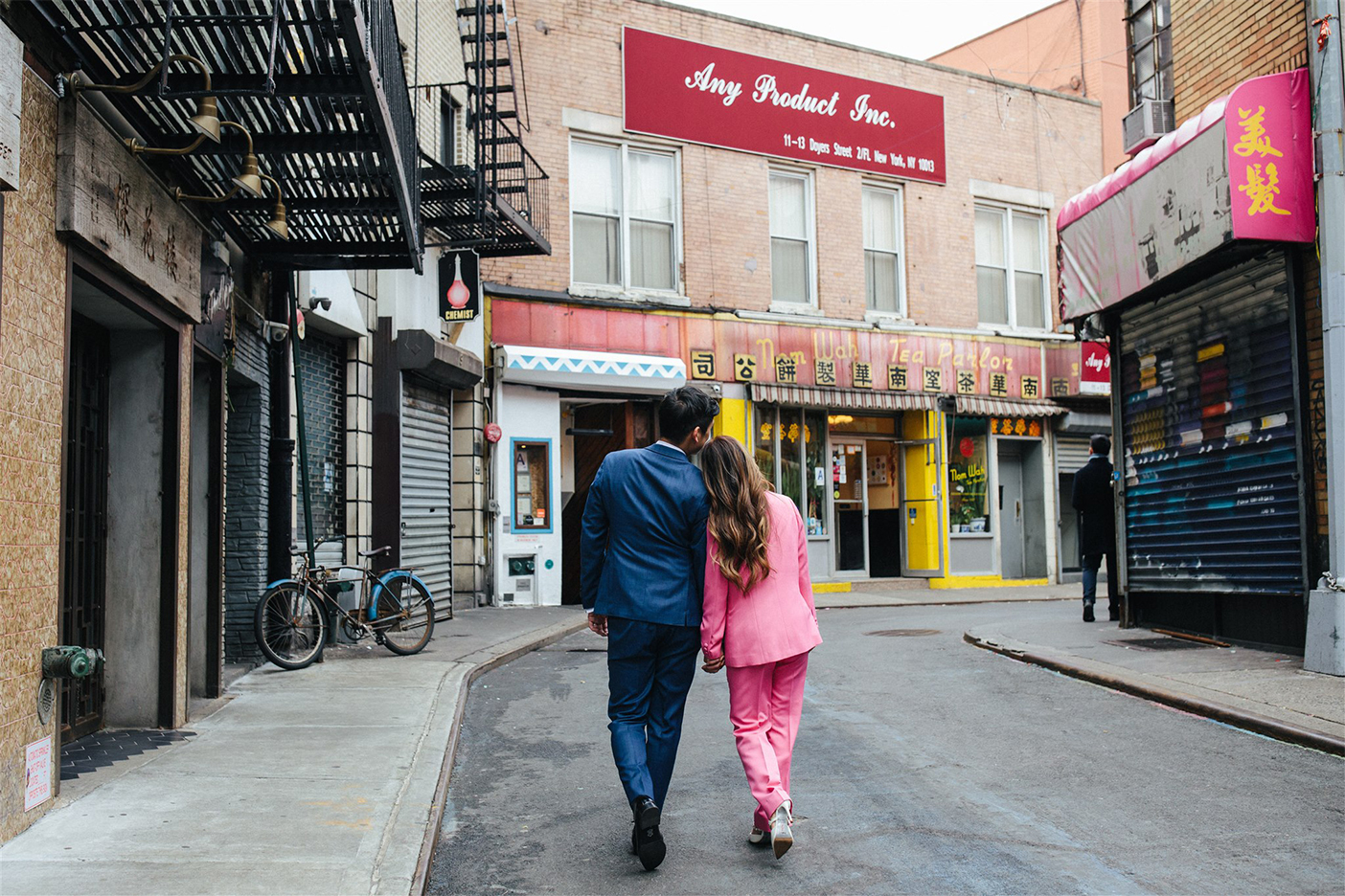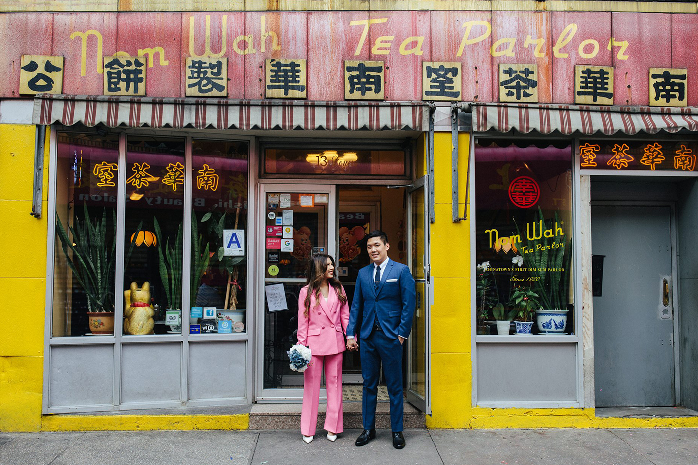 In late January, the two flew to the Big Apple, put on their favorite suits (hers pink; his navy), and made it official in front of a judge and six friends at City Hall. Later that night, Cindy changed into a red dress (like the one her mom wore at her own wedding), and the party continued with dinner at the Nom Wah Tea Parlor, a dim sum institution in Chinatown, where they skipped cake in favor of dumplings and scallion pancakes. The group eventually wandered to a rooftop and danced until the early morning.