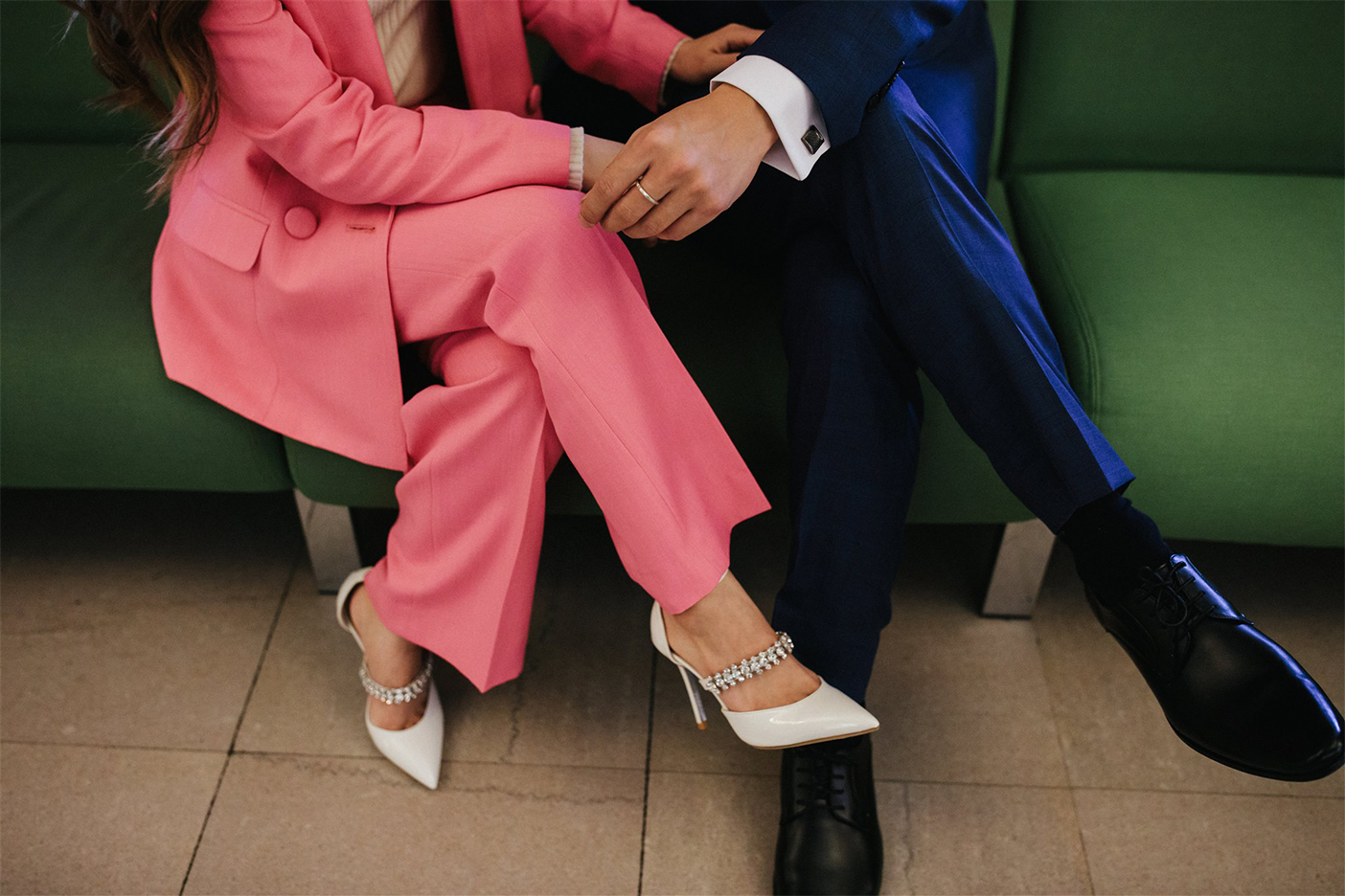 An unconventional wedding calls for a similarly bold outfit. “I just didn’t see myself as a bride who would wear white,” says Cindy. “My personality is more pinky red.” So when she spotted a bubblegum pink suit on Instagram, she had a similar version custom-made in Taiwan. Her crystal-encrusted shoes were handmade there, as well.
