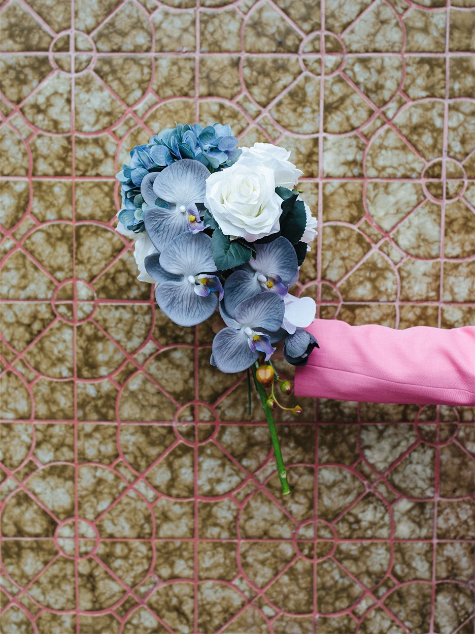 Cindy made her own everlasting bouquet from plastic flowers she found in Taiwan. One major benefit of using fake blooms? They’re travel-friendly. “You can take it back with you in your suitcase as a memento,” she says. She also plans to use the buds again for their bigger orchid-themed Chinese wedding next year.