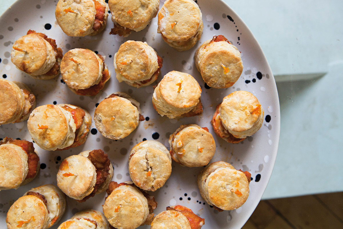 Pies ’n’ Thighs, a nearby fried chicken joint, delivered banana cream pies and bite-size chicken biscuits. Young placed brightly colored bowls of jelly beans and Pop Rocks around the apartment, as well as custom-printed napkins featuring “lyrics from the classic Kool & the Gang wedding jam.”