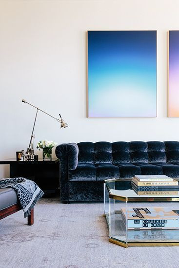A dark, plush couch goes magically well with a clean glass table. Opposites attract, right?