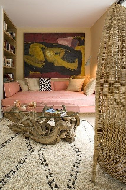 Look for a table with a sculptural base and glass top for an eclectic addition. Keep tabletop decor minimal to aim the focus on the base. We love the amazing wood on this one!