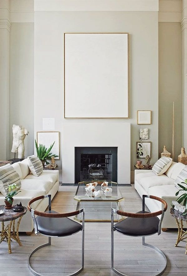 The combination of framed artwork, monochromatic furniture, and a sleek glass table immediately looks artistic. A