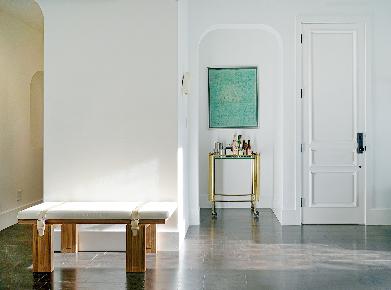 Irijalba, who uses stone in his artwork, paid extra attention to the backsplash choice, selecting the exact slab from an enormous warehouse and visiting the stonecutter to mark out the exact dimensions. “We measured every glass and container we own, as well as my arm span when considering the height of each cupboard,” adds Hill. Leveraging her cooking school experience, she maximized every square inch to make sure everything had its place. The rounded edge of the peninsula adds softness to a high-traffic corner.