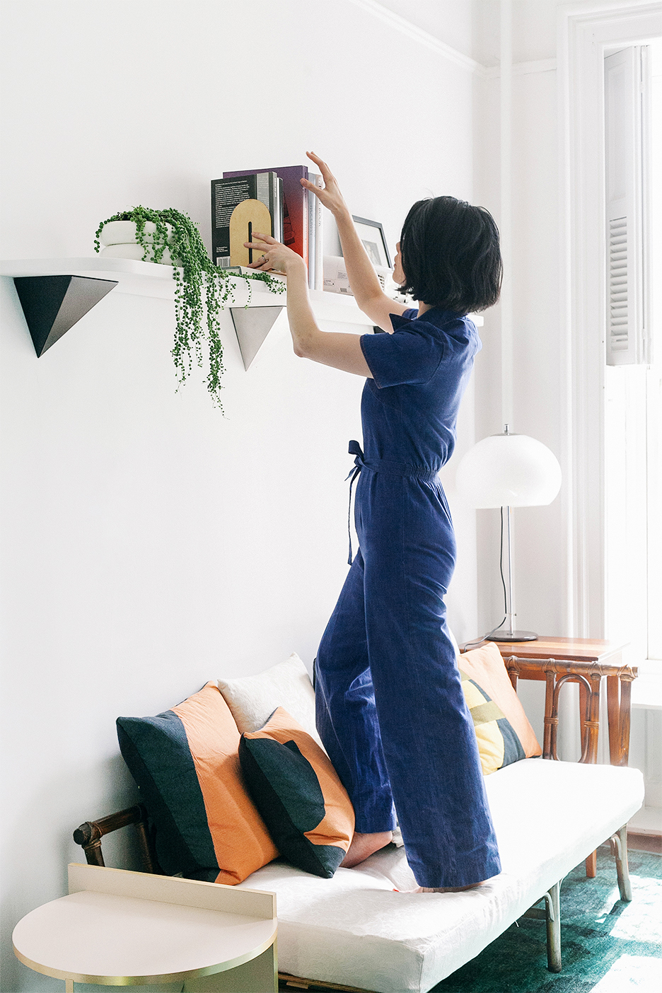 Downstairs, Hill made the most of a dimly lit bathroom with an allover pillow tile treatment. “I was desperately trying not to build a white space, but the low light made it difficult to choose a darker color,” she says. She still got a punchy accent via a navy floor with contrasting trim. To add privacy in the shower while still letting a bit of light through, Hill stacked glass bricks from floor to ceiling. “I’ve always loved them, especially in the Ishihara House designed by Tadao Ando,” she notes. Only one thing is missing, she adds: a low-light, humidity-loving plant baby.