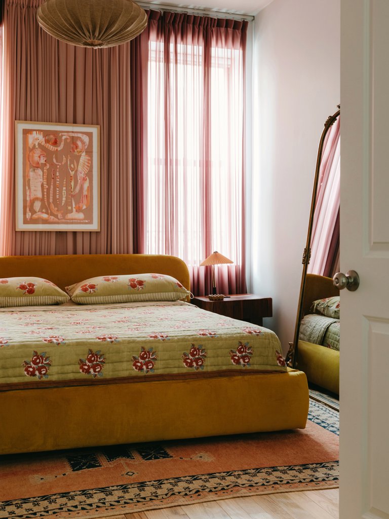 Art sits above this brass coffee cart. Outfit yours with quirky dishware to make it ultra-personalized.