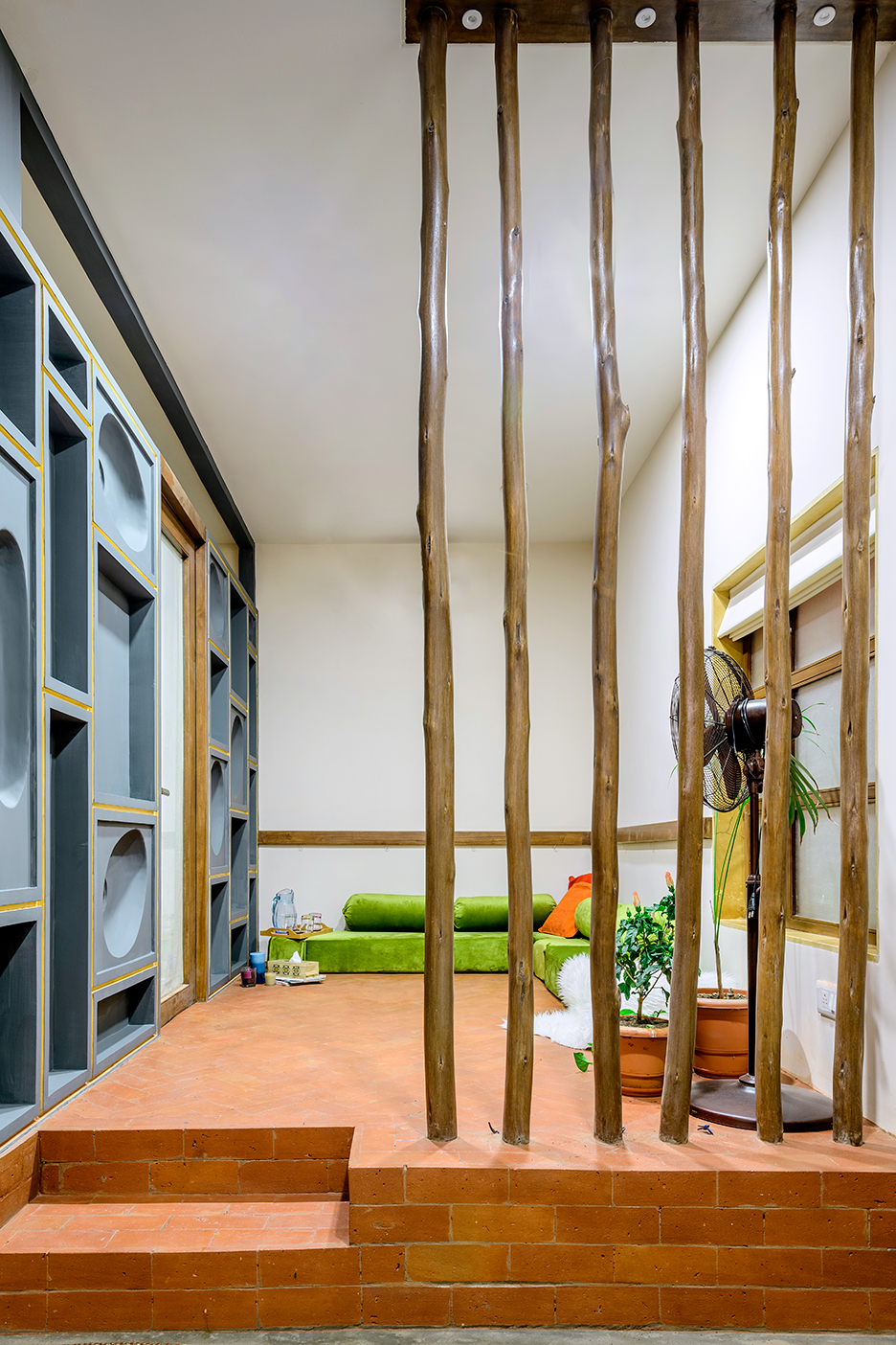 While her design departed from the style of a typical Gujarati home, Trivedi still wanted to pay homage to her culture and surroundings. She filled the apartment with handcrafted furniture and natural materials like brick, teakwood, and ochre-hued jaisalmer stone. In her second bedroom-turned-den, tall bamboo poles provide support for a screen that rolls down to become a mini movie theater, with the help of a small projector.