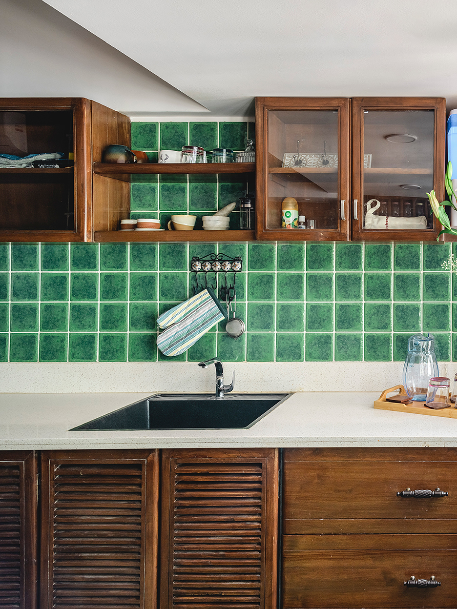 When Satviki Trivedi tore down one of the walls in the kitchen of her Ahmedabad, India, apartment, she discovered something unexpected: A neem tree so green and lush that it immediately filled the home with its presence. “I was so excited to invite that tree into my space,” says the 26-year-old interior designer. And so she did, at least metaphorically—adding green tiles and flooring to the kitchen to mirror the foliage and opening up her one-bedroom to nature.