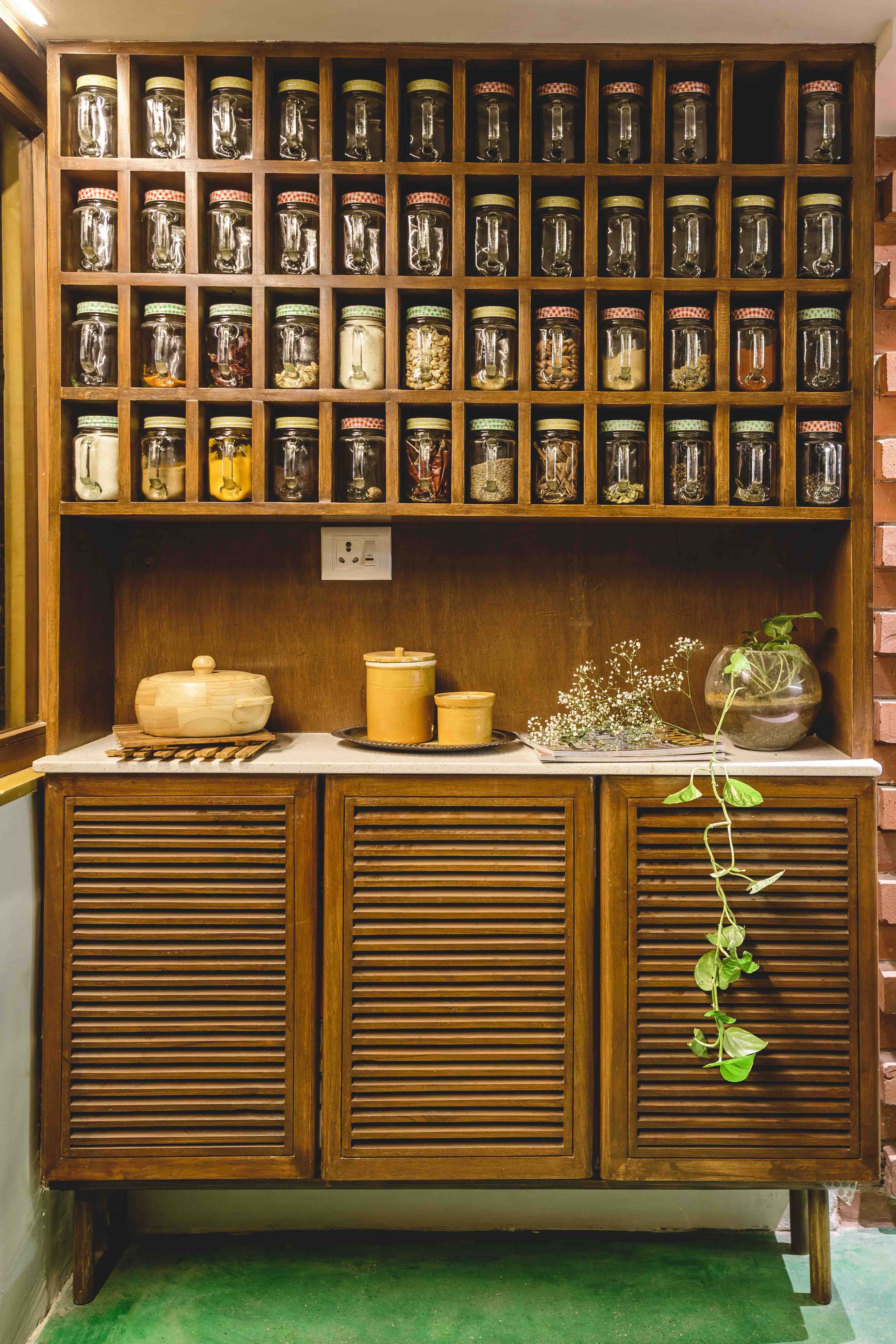 Built-in alcoves for candles in her bedroom are inspired by Diwali, the Hindu festival of lights, while the brass chains that extend from her bed’s platform to the ceiling are traditionally used for swings found on the verandas of Gujarati homes. In the floor of her living room, Trivedi inlaid earthen bowls typically used to make rotlas, a type of Gujarati bread. And in her kitchen, she built a cabinet with 48 niches that she filled with clear jars of Indian spices, making them easy to grab—much to the satisfaction of her father, who happens to be a chef.