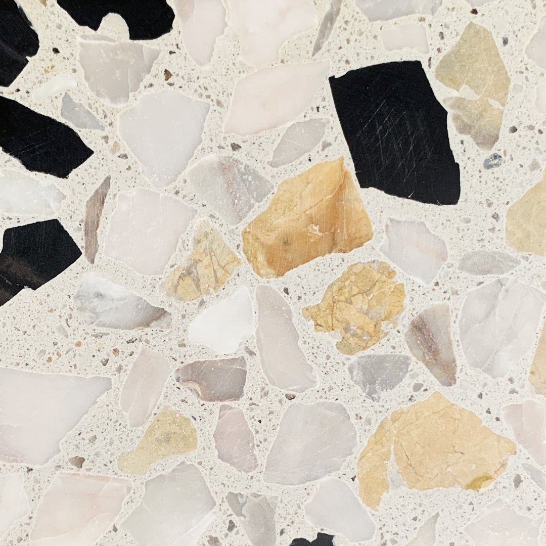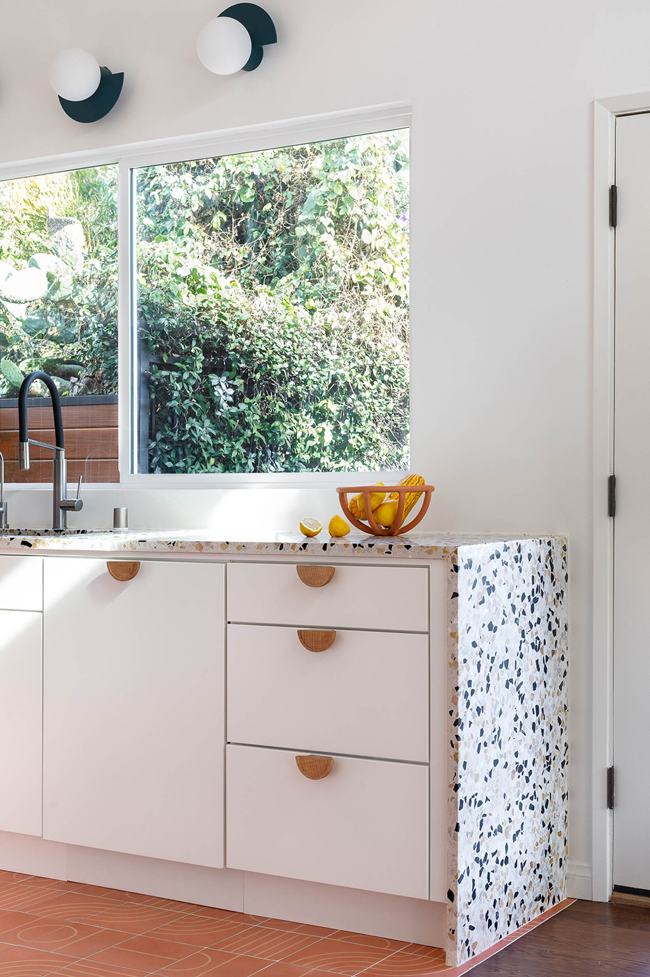 “When it rains, it really pours,” is the best way Aker can describe their experience putting in the new countertops. The original terrazzo surface they ordered from a company she had never worked with before showed up half an inch shorter than they planned for. Panic started to set in, not only because they would have to start all over but also because Kristina was planning a surprise birthday party for her husband, Eli. A quick fix: Aker rang up Concrete Collaborative in San Diego and asked if it had slabs of a chunky yellow and black marble chip composite at its factory. Fortunately the company had enough for the surface and then some for details like the integrated Wolf cooktop and the waterfall edge. “It felt like a waste just to have white cabinets on the side, especially because it’s the first thing you see when you come in the front door,” the designer says of the feature.
