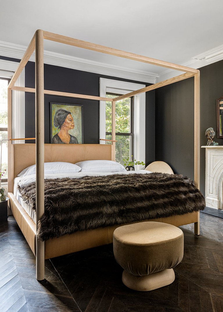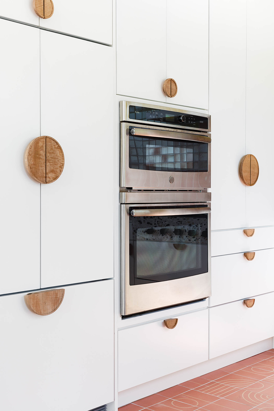 Standard bar pulls didn’t feel “fun enough” for the space, so Aker opted for oversize half-moon white-oak handles for the cupboard doors made by her husband’s woodworking company, Aker Studio. The curvy shape helps balance out all the straight angles in the room, lending some softness. Plus, because the cabinets are white, the designer felt comfortable going a bit funkier with the element.