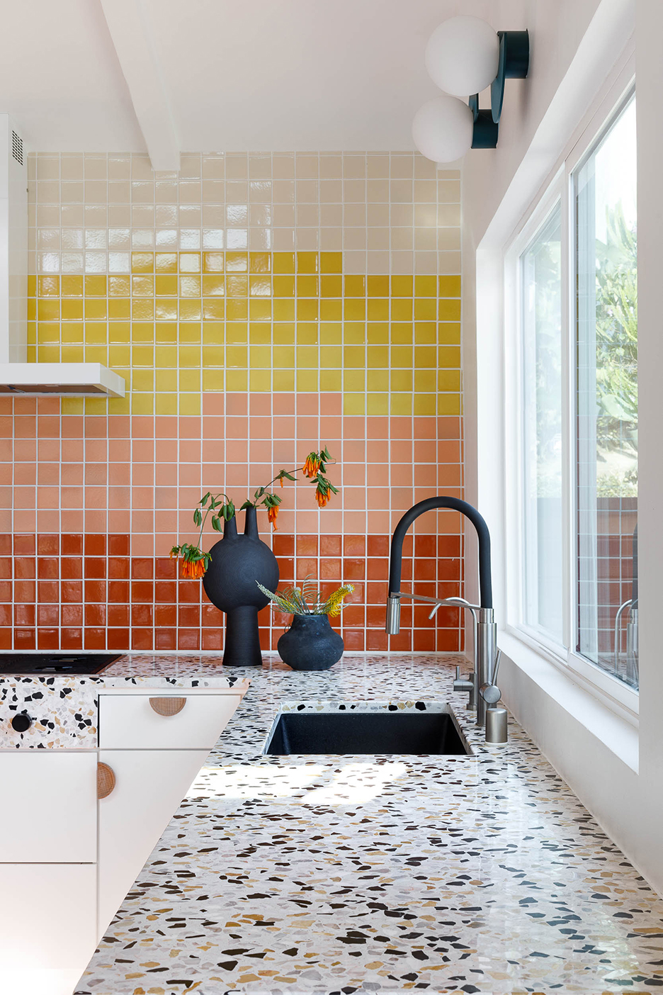 Most renovators wouldn’t dare cover up a window, especially in an already-tiny space where natural light is hard to come by. But most people might not see the potential designer Gabrielle Aker did when she walked into a young couple’s kitchen in Los Angeles’s El Sereno neighborhood. Where there was once a standard rectangular opening looking out onto the street, there’s now a Tetris-like backsplash. “I feel like I got to flex a muscle that I don’t get to very often,” says Aker of going all out with color (the wife, Kristina, is obsessed with orange). “She’s wasn’t like, ‘I saw this picture on Pinterest; can you copy it?’ She told me to find something new.”