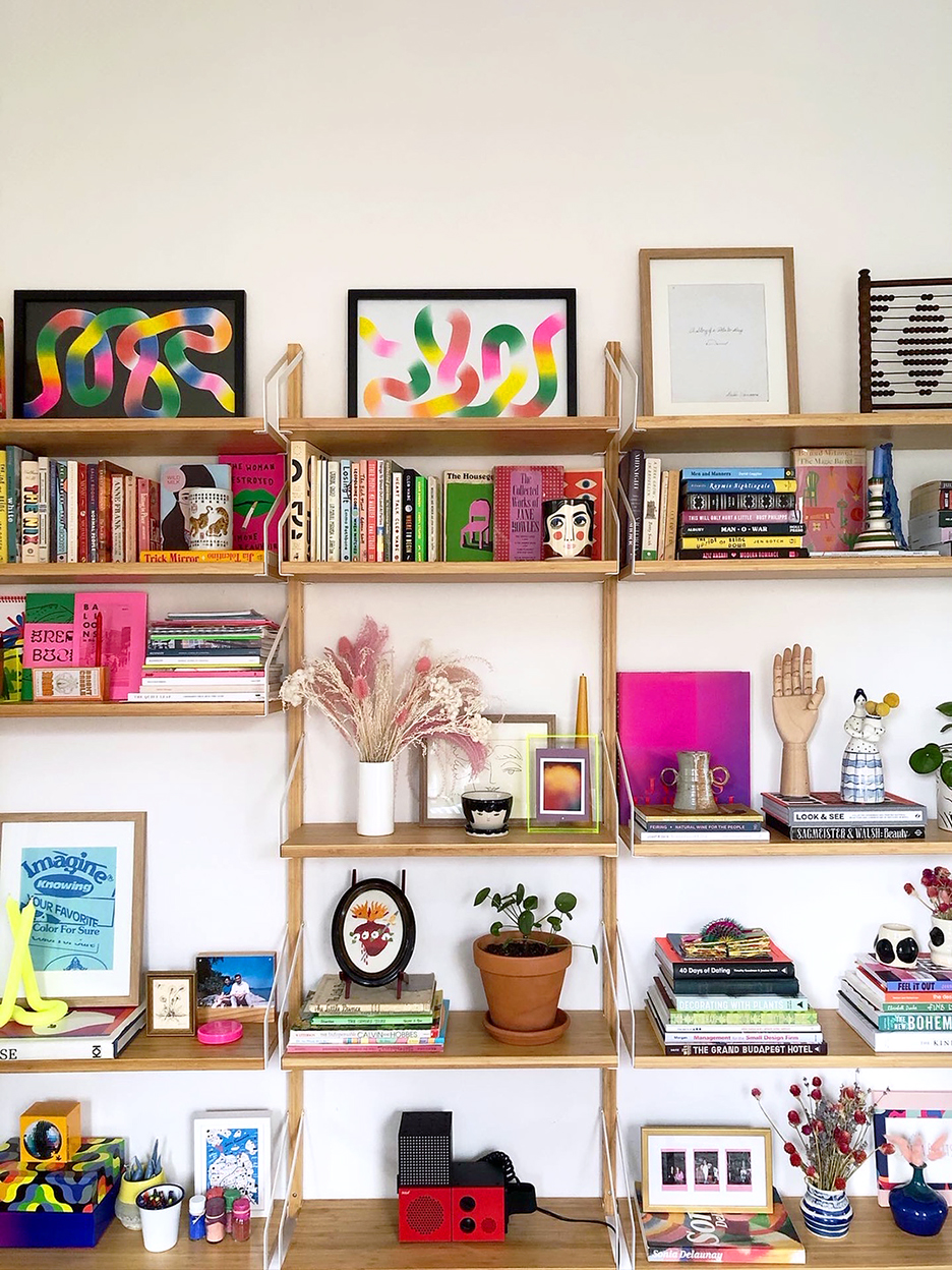 In the kitchen, they decided to hang up all food-related art, from prints to framed menus, while in the bedroom, Brettschneider pulled out the pieces she had that best matched her rug, even framing an old Guggenheim Museum brochure to make the gallery wall more cohesive. But nowhere is her curatorial eye more apparent than on the IKEA Svalnäs shelf she bought just for this apartment.