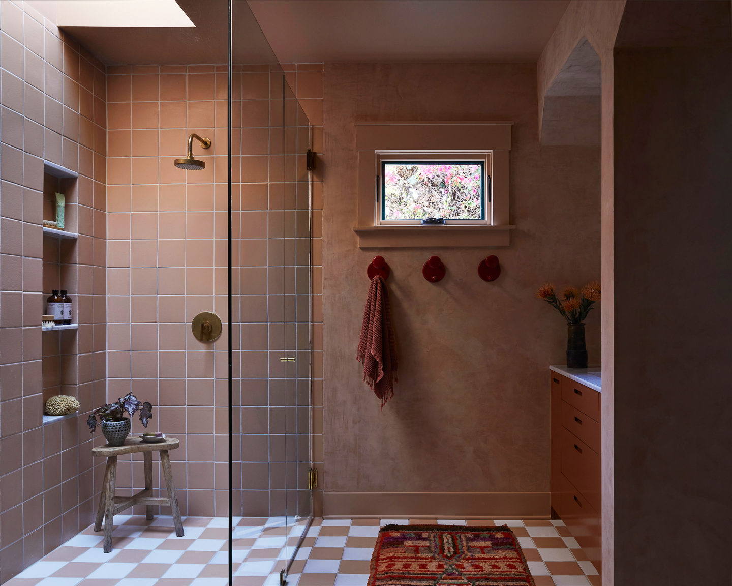 In the vein of doing less, Breer covered the guest bathroom in a striped tile pattern, carrying the squares up the shower walls and down the side of the tub. The arrangement was subtly inspired by Union Station’s Fred Harvey Room, designed by Mary Colter, where the floor tiles take on the look of textiles. Breer carried the earthy pink tone from the main bedroom into the en suite with Roman clay walls, which were color-matched to coordinate with the large-format square floor tiles. “It feels like an updated West Coast take on the black-and-white checkered floor we had in our little prewar apartment in New York,” says Bowling.