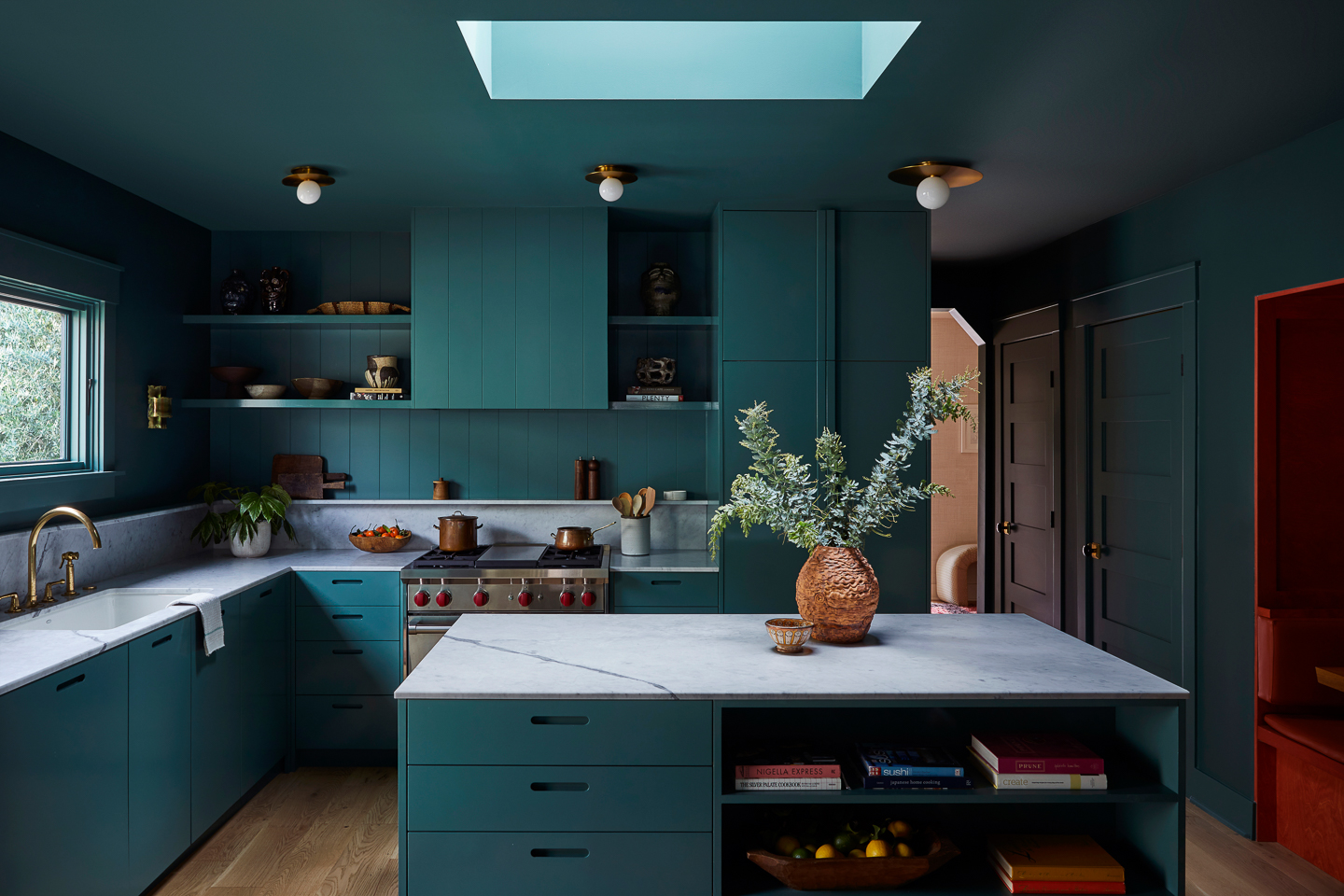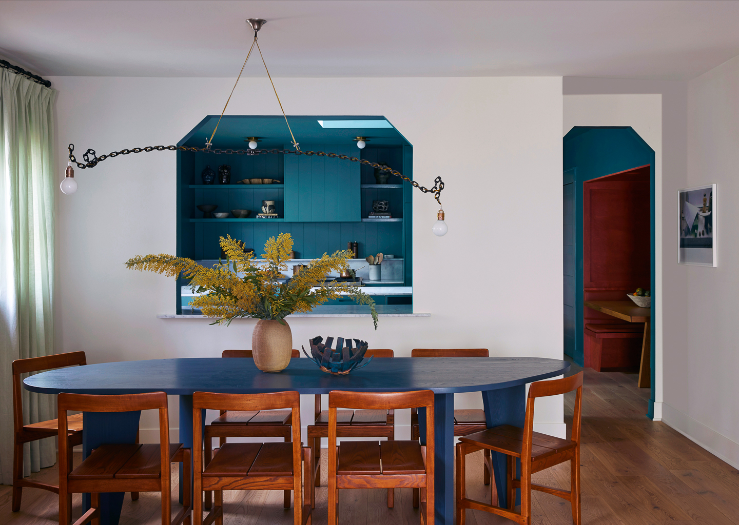 “The brief was kind of rare, but a testament to them: intimate and saturated,” says Breer, who designed all of the interior thresholds to look like keyhole cutouts—an effort to bring in some old-world charm. In the kitchen they purposely dropped the ceiling height over the banquette to create a sense of coziness, but—not wanting to compromise on natural light—added a pass-through looking out onto the dining and living area. “We wanted a little separation between church and state,” explains Breer. “If your countertops are messy, you don’t want to see it while you’re watching TV.”